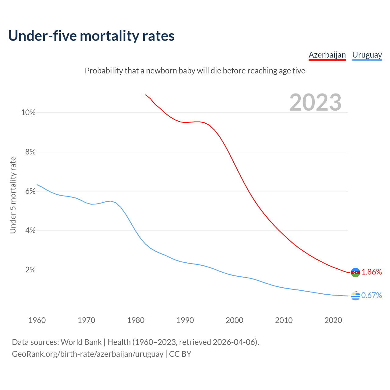 The chance that a newborn baby will die before reaching age five is 1.86% in Azerbaijan and 0.67% in Uruguay. Above is a chart with historical data on under-five mortality rates.