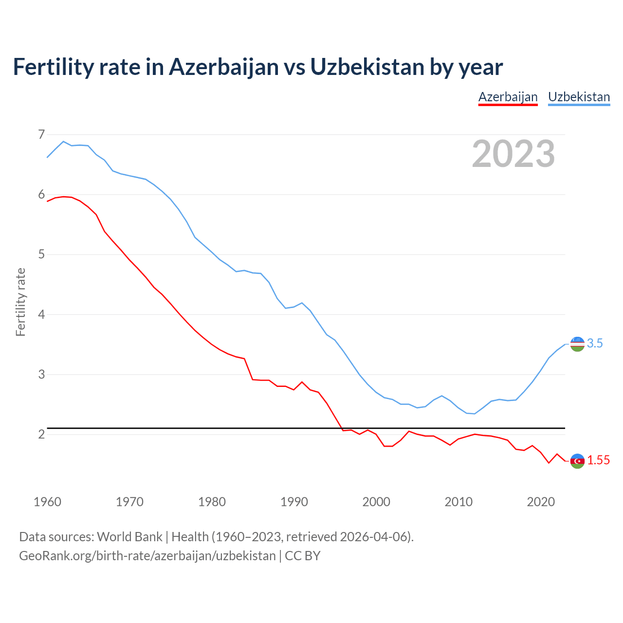 1960 vs 2023, the fertility rate has decreased by 73.6% in Azerbaijan and by 47.1% in Uzbekistan — in 1960, it was 5.88 and 6.61, respectively.