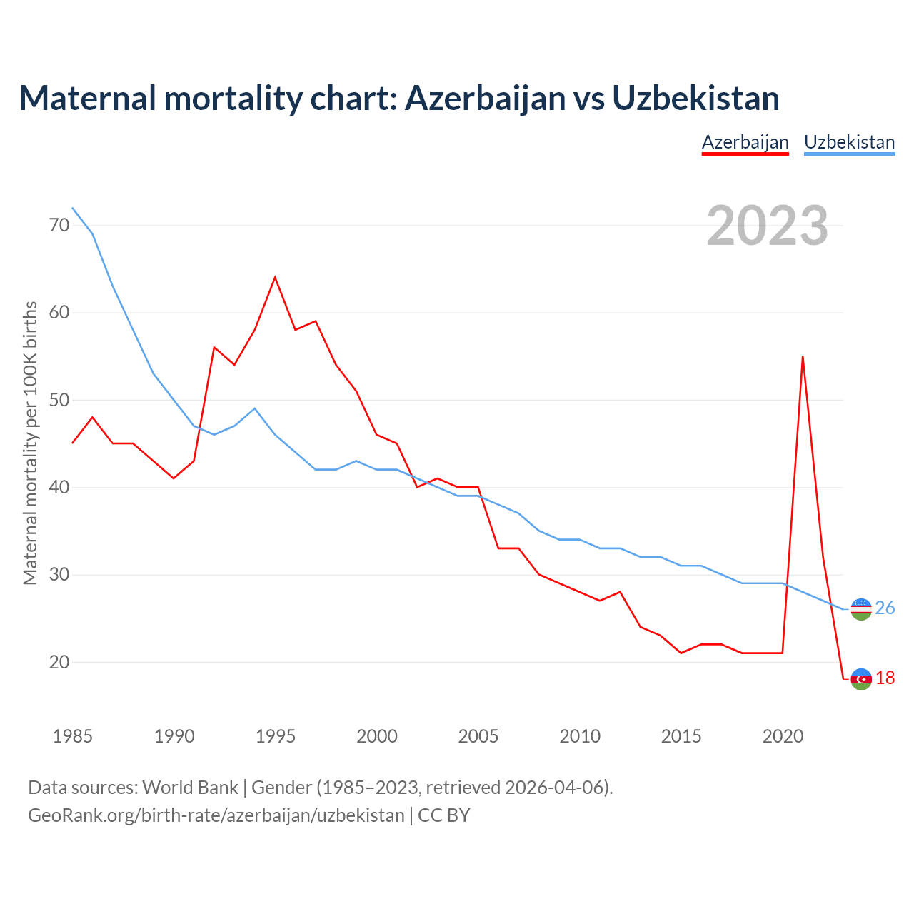 The maternal mortality rate, which is the probability of dying during childbirth or within 42 days of pregnancy termination, is 18 deaths per 100,000 live births in Azerbaijan, compared to 26 deaths in Uzbekistan.