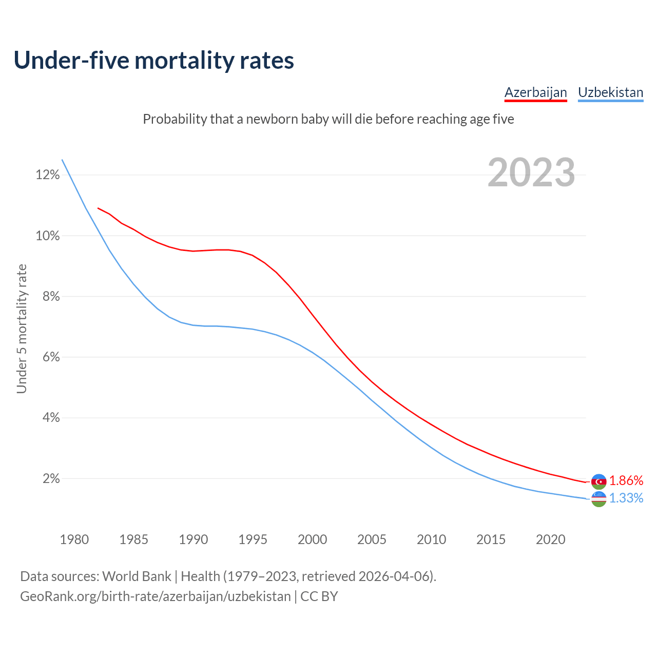 The chance that a newborn baby will die before reaching age five is 1.86% in Azerbaijan and 1.33% in Uzbekistan. Above is a chart with historical data on under-five mortality rates.