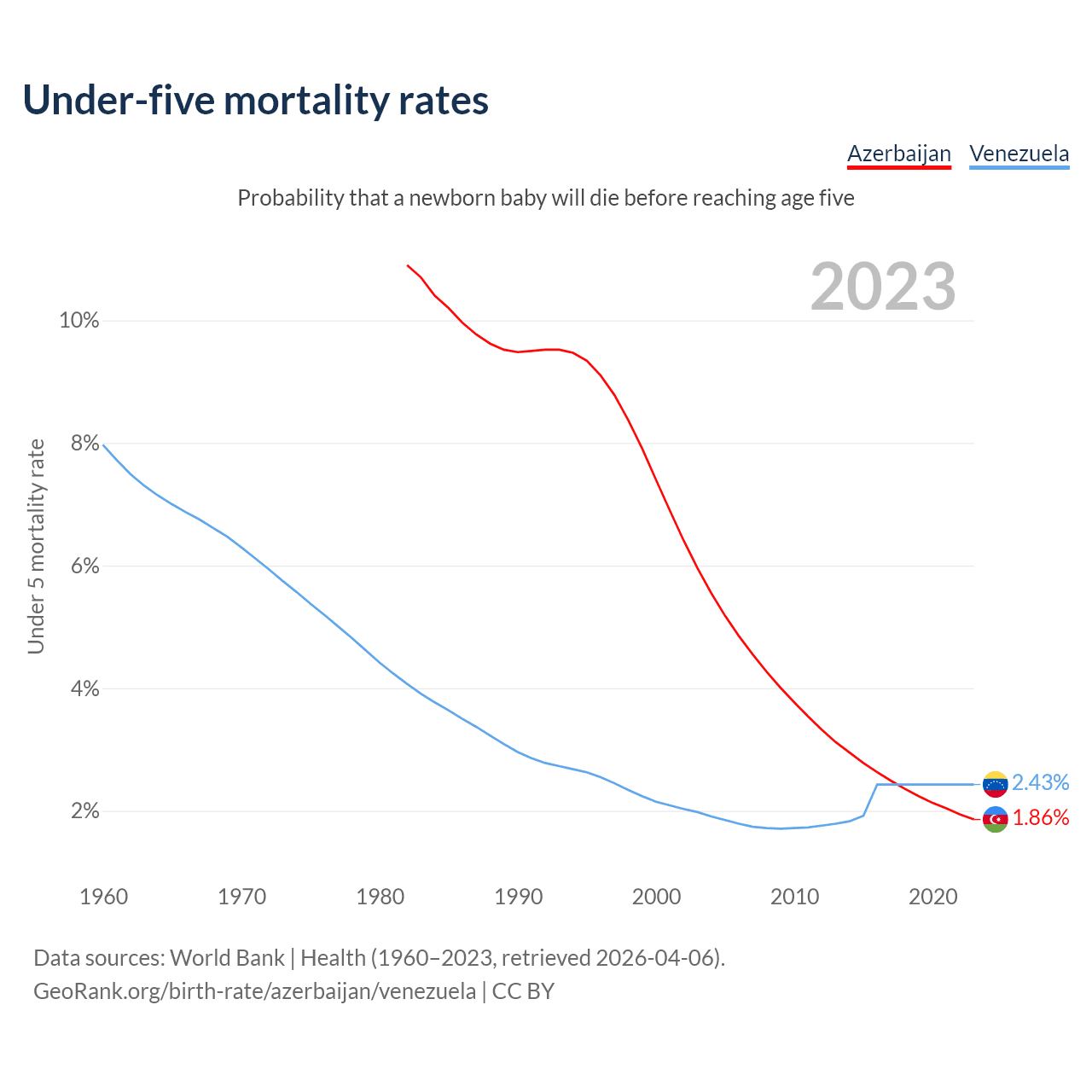 The chance that a newborn baby will die before reaching age five is 1.86% in Azerbaijan and 2.43% in Venezuela. Above is a chart with historical data on under-five mortality rates.