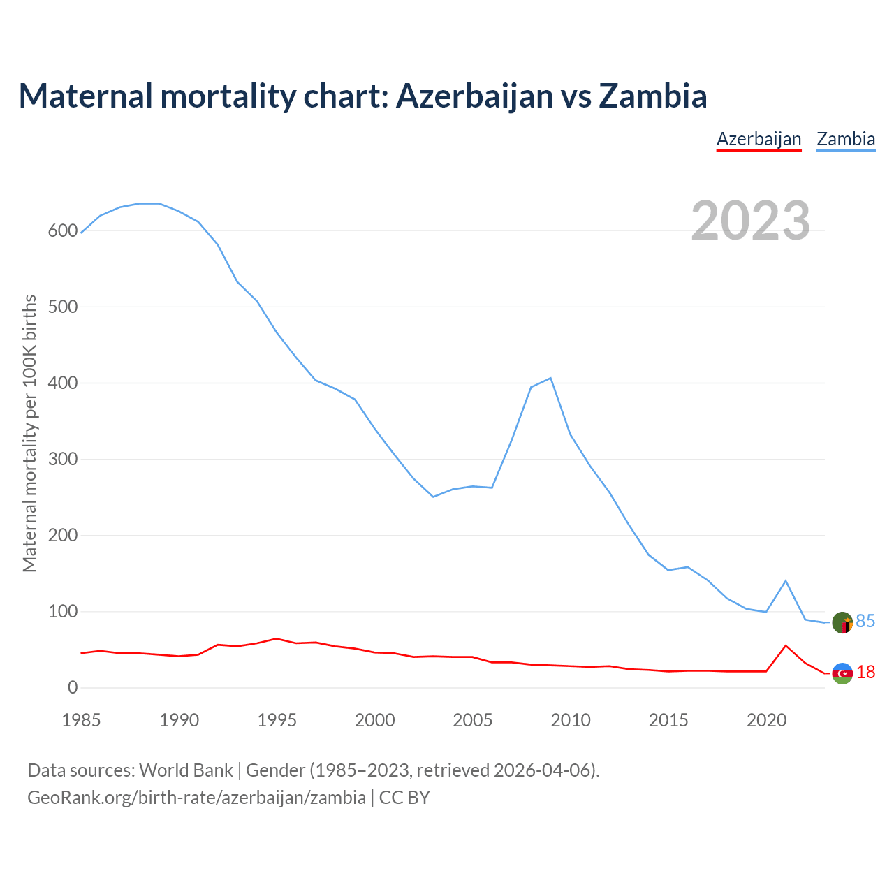 The maternal mortality rate, which is the probability of dying during childbirth or within 42 days of pregnancy termination, is 18 deaths per 100,000 live births in Azerbaijan, compared to 85 deaths in Zambia.
