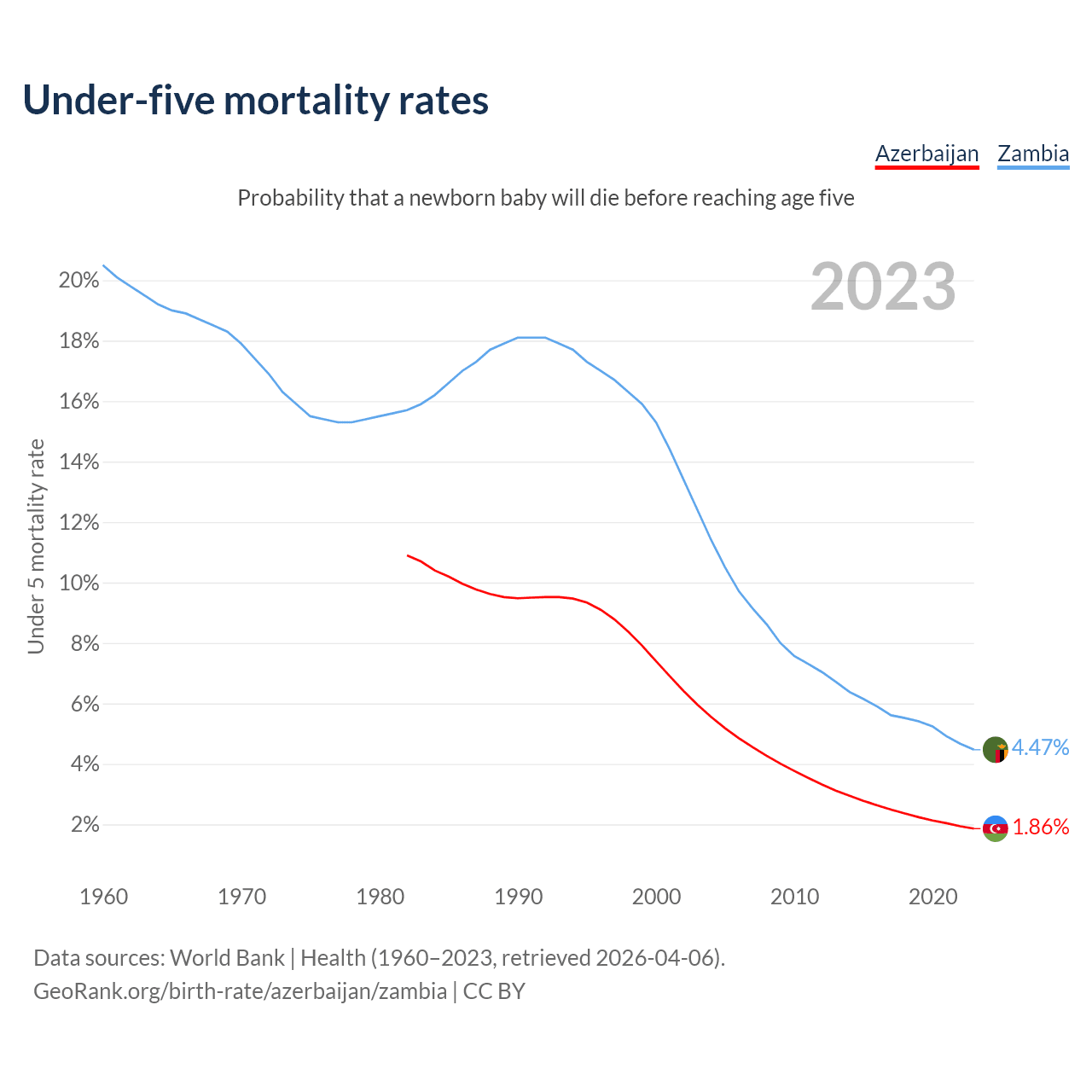 The chance that a newborn baby will die before reaching age five is 1.86% in Azerbaijan and 4.47% in Zambia. Above is a chart with historical data on under-five mortality rates.