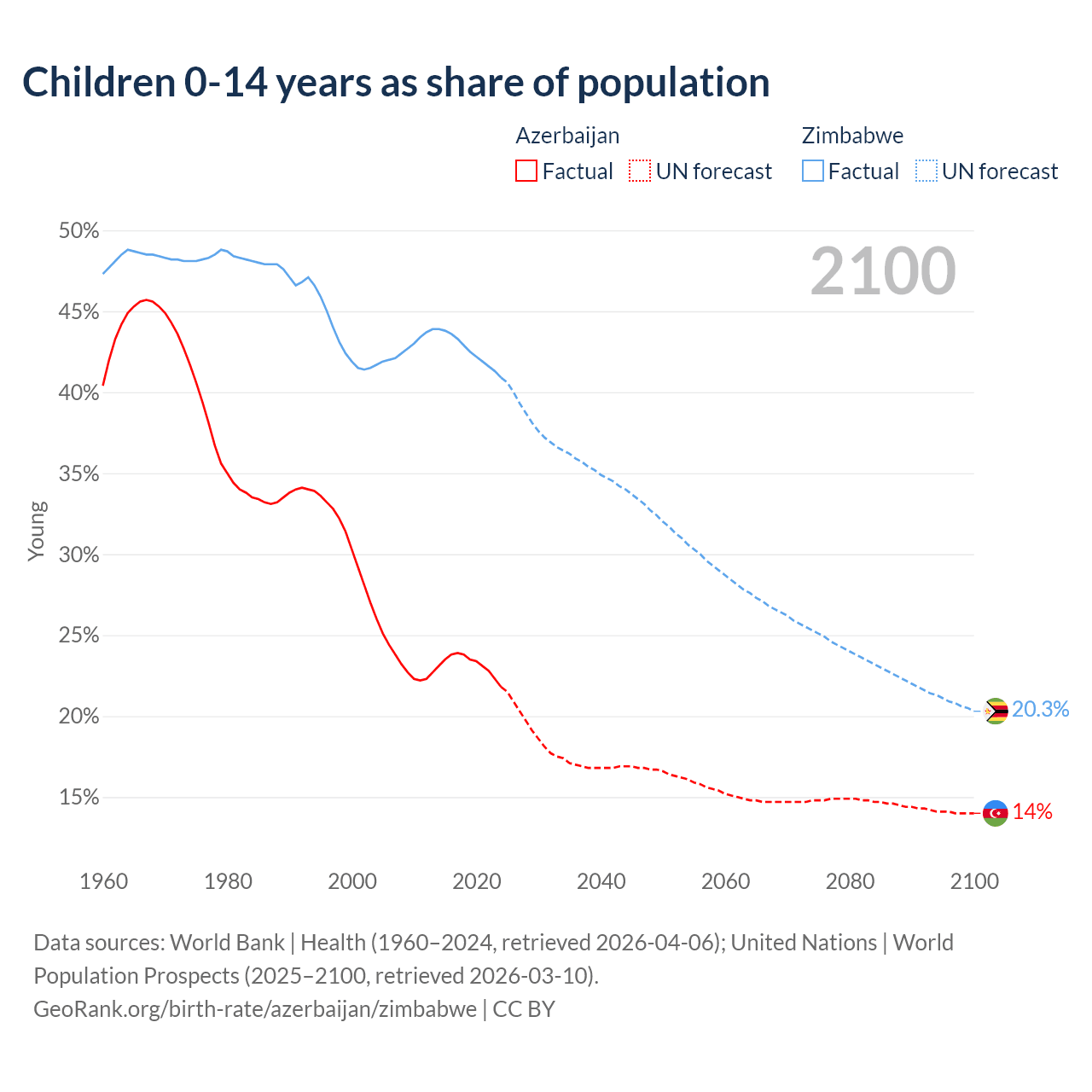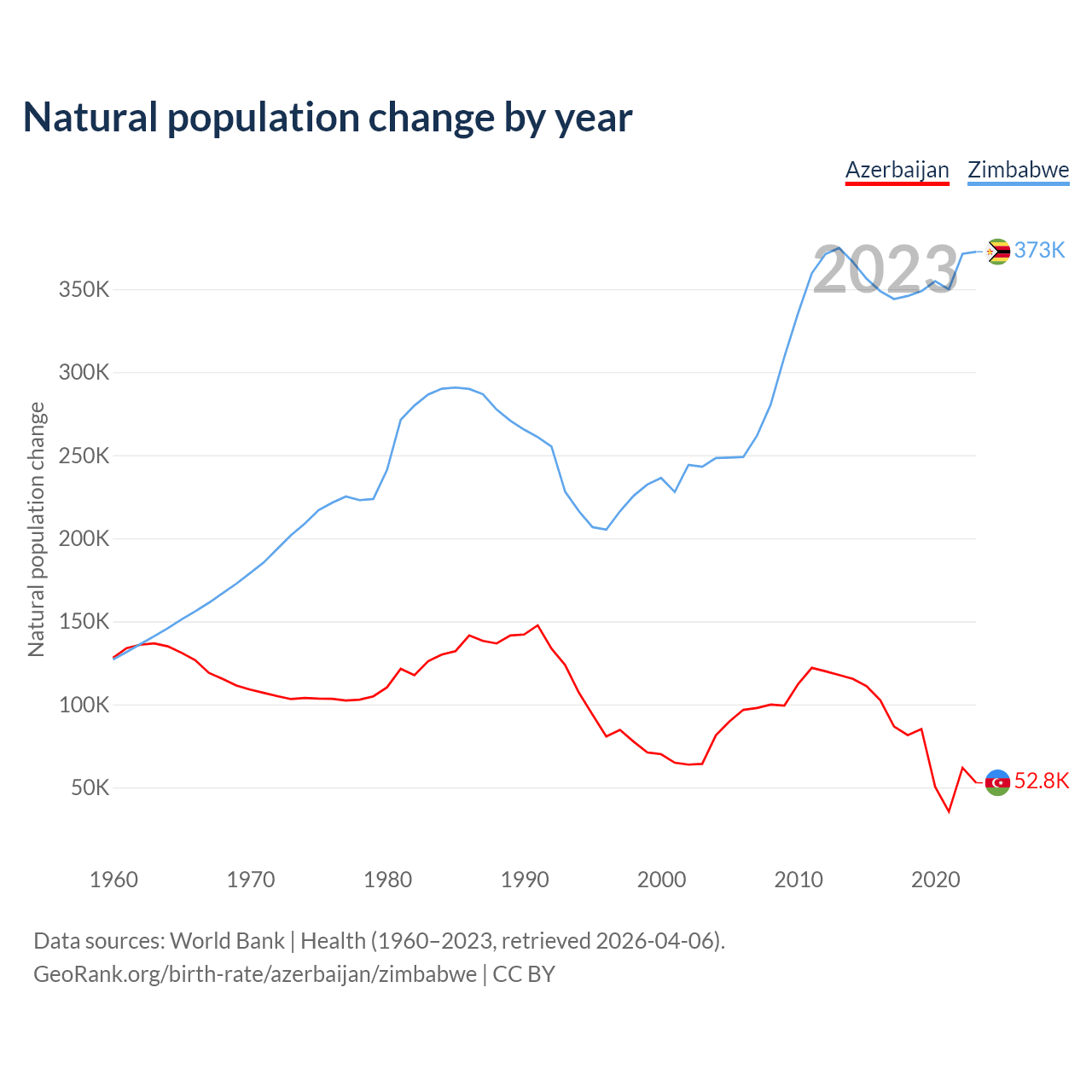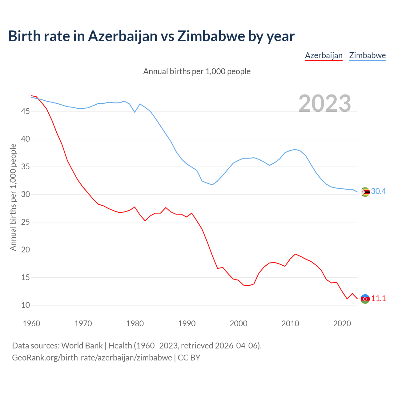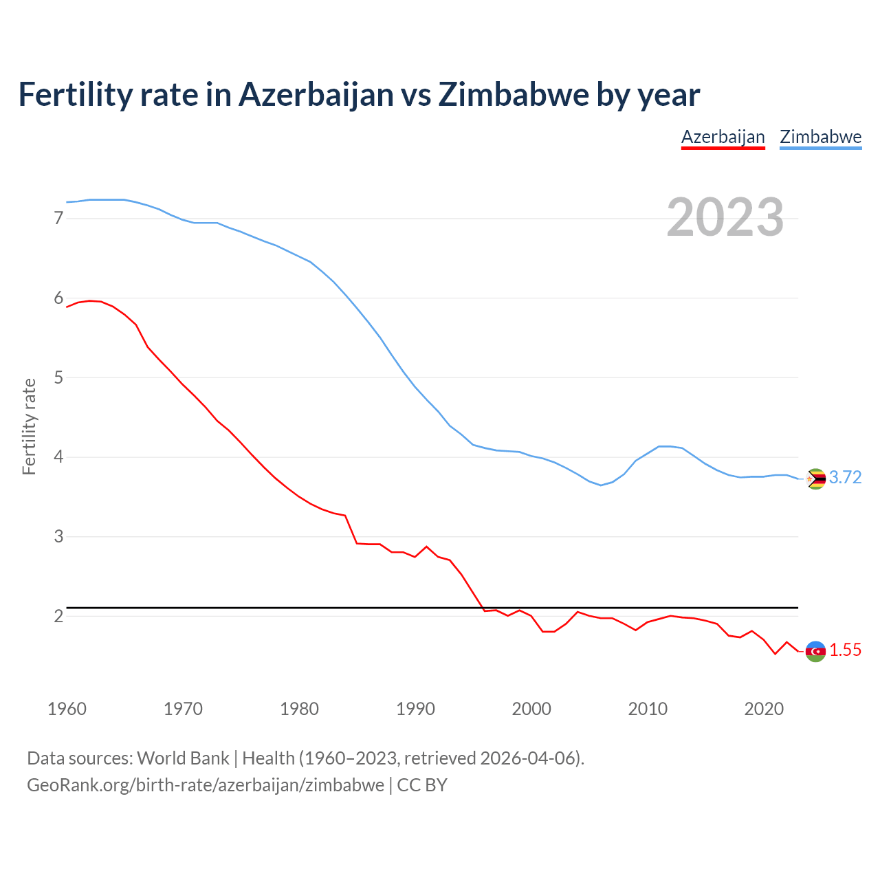 Azerbaijan has an annual birth rate of 11.1 births per 1,000 people, compared to 30.4 for Zimbabwe. The average number of children a woman is expected to have during her lifetime — the fertility rate, is 1.55 in Azerbaijan and 3.72 in Zimbabwe — 140.3% difference.