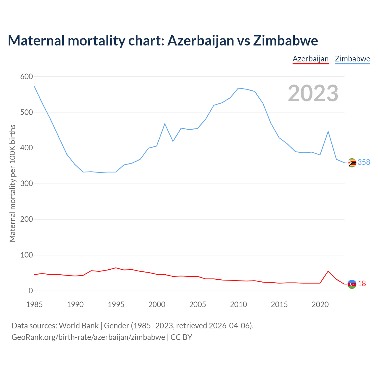 The maternal mortality rate, which is the probability of dying during childbirth or within 42 days of pregnancy termination, is 18 deaths per 100,000 live births in Azerbaijan, compared to 358 deaths in Zimbabwe.