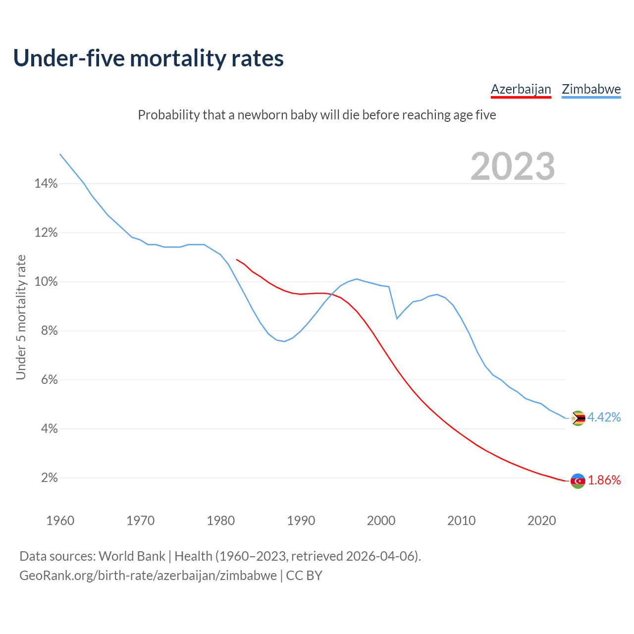 The chance that a newborn baby will die before reaching age five is 1.86% in Azerbaijan and 4.42% in Zimbabwe. Above is a chart with historical data on under-five mortality rates.