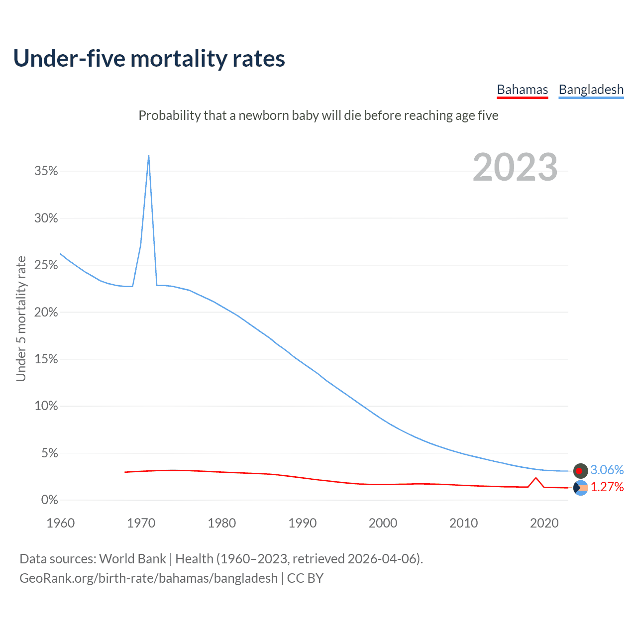 The chance that a newborn baby will die before reaching age five is 1.27% in the Bahamas and 3.06% in Bangladesh. Above is a chart with historical data on under-five mortality rates.
