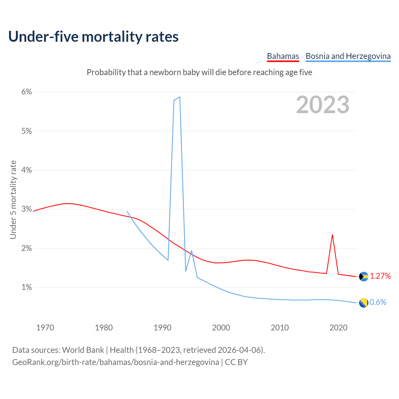The chance that a newborn baby will die before reaching age five is 1.27% in the Bahamas and 0.6% in Bosnia and Herzegovina. Above is a chart with historical data on under-five mortality rates.