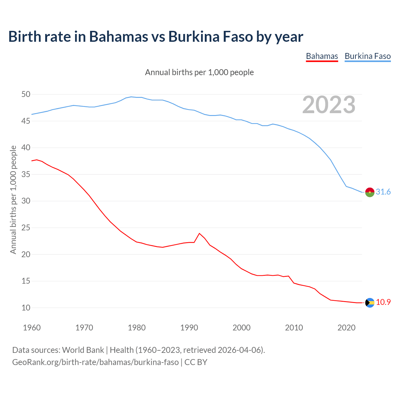 The Bahamas has an annual birth rate of 10.9 births per 1,000 people, compared to 31.6 for Burkina Faso. The average number of children a woman is expected to have during her lifetime — the fertility rate, is 1.37 in the Bahamas and 4.19 in Burkina Faso — 204.9% difference.