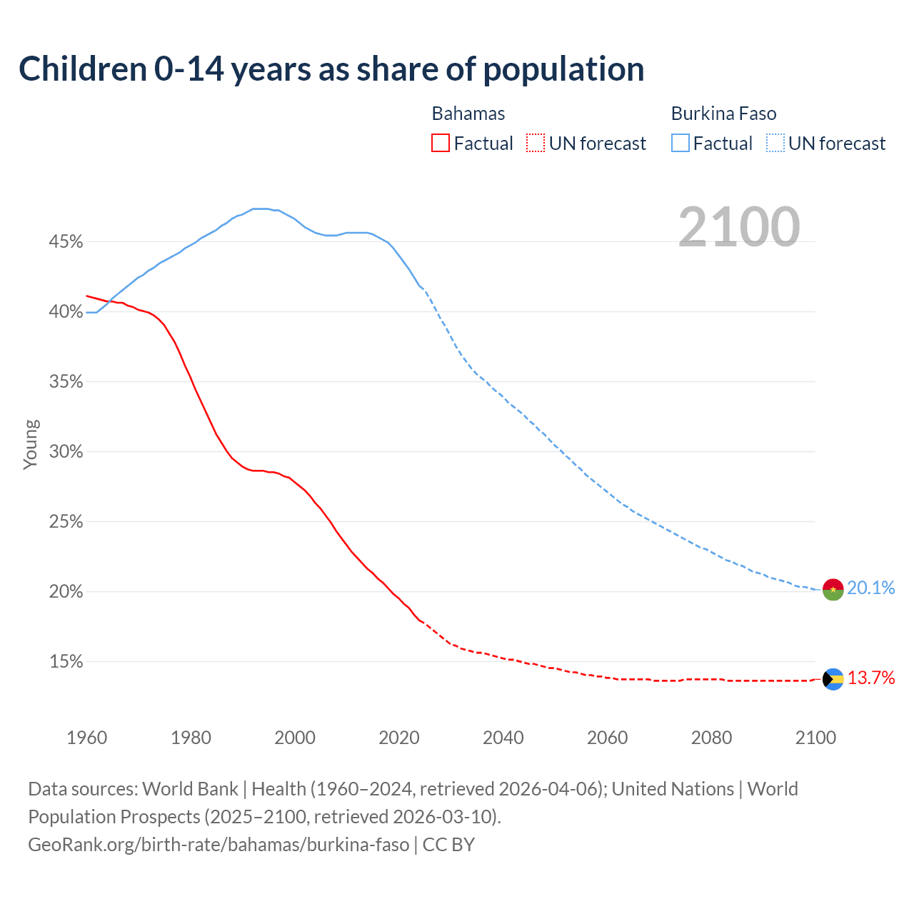 According to the latest available data on birth rates, the fertility rate in the Bahamas was 1.37 children per woman in 2023, compared to 4.19 in Burkina Faso in 2023. The replacement level is considered to be 2.1 children per woman.