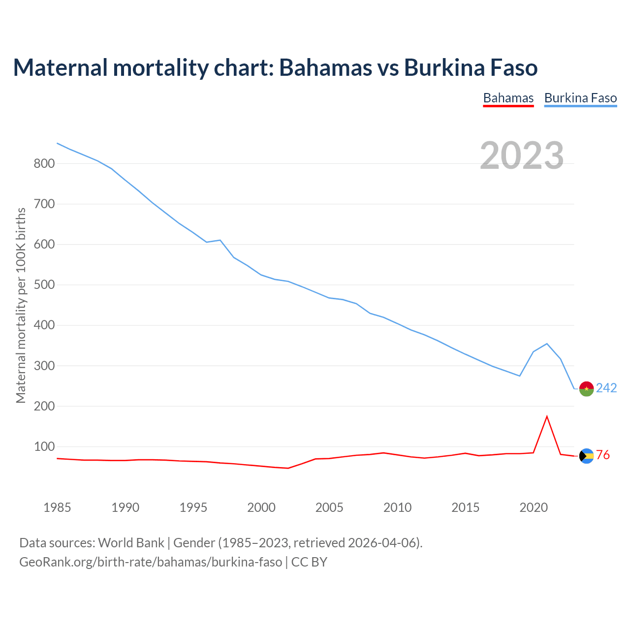 The maternal mortality rate, which is the probability of dying during childbirth or within 42 days of pregnancy termination, is 76 deaths per 100,000 live births in the Bahamas, compared to 242 deaths in Burkina Faso.