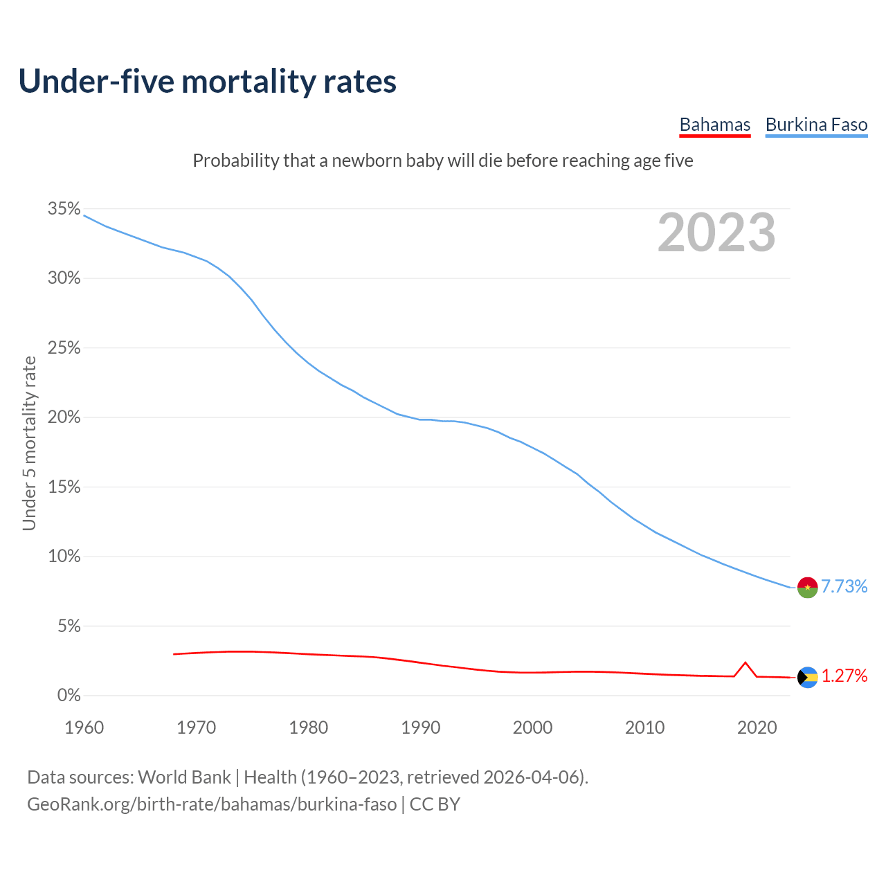 The chance that a newborn baby will die before reaching age five is 1.27% in the Bahamas and 7.73% in Burkina Faso. Above is a chart with historical data on under-five mortality rates.