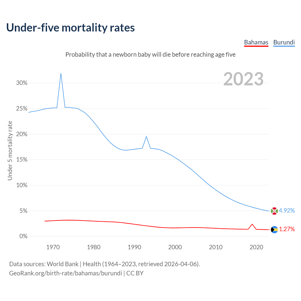 The chance that a newborn baby will die before reaching age five is 1.27% in the Bahamas and 4.92% in Burundi. Above is a chart with historical data on under-five mortality rates.