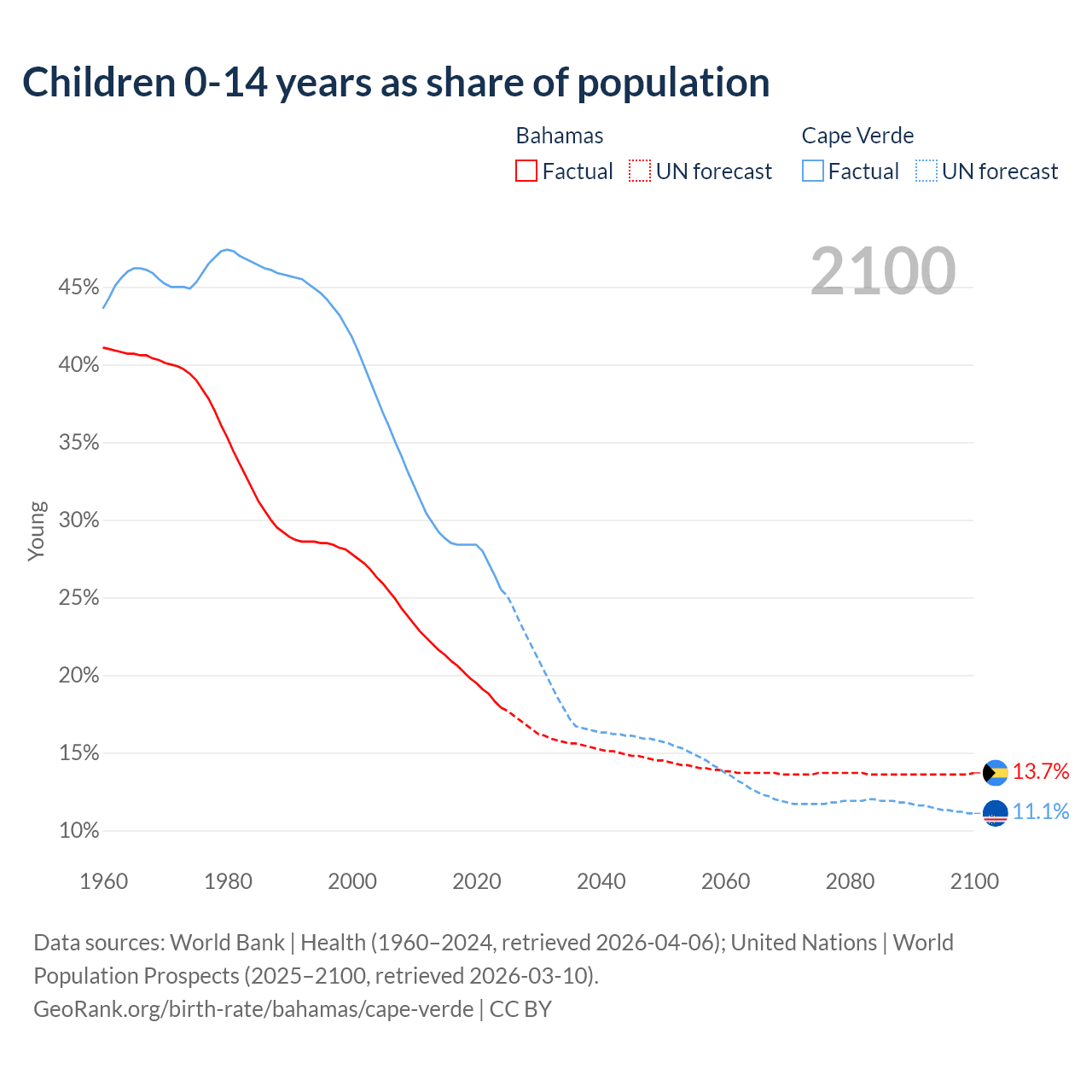 According to the latest available data on birth rates, the fertility rate in the Bahamas was 1.37 children per woman in 2023, compared to 1.52 in Cape Verde in 2023. The replacement level is considered to be 2.1 children per woman.