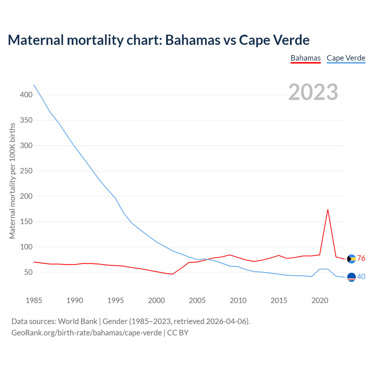 The maternal mortality rate, which is the probability of dying during childbirth or within 42 days of pregnancy termination, is 76 deaths per 100,000 live births in the Bahamas, compared to 40 deaths in Cape Verde.