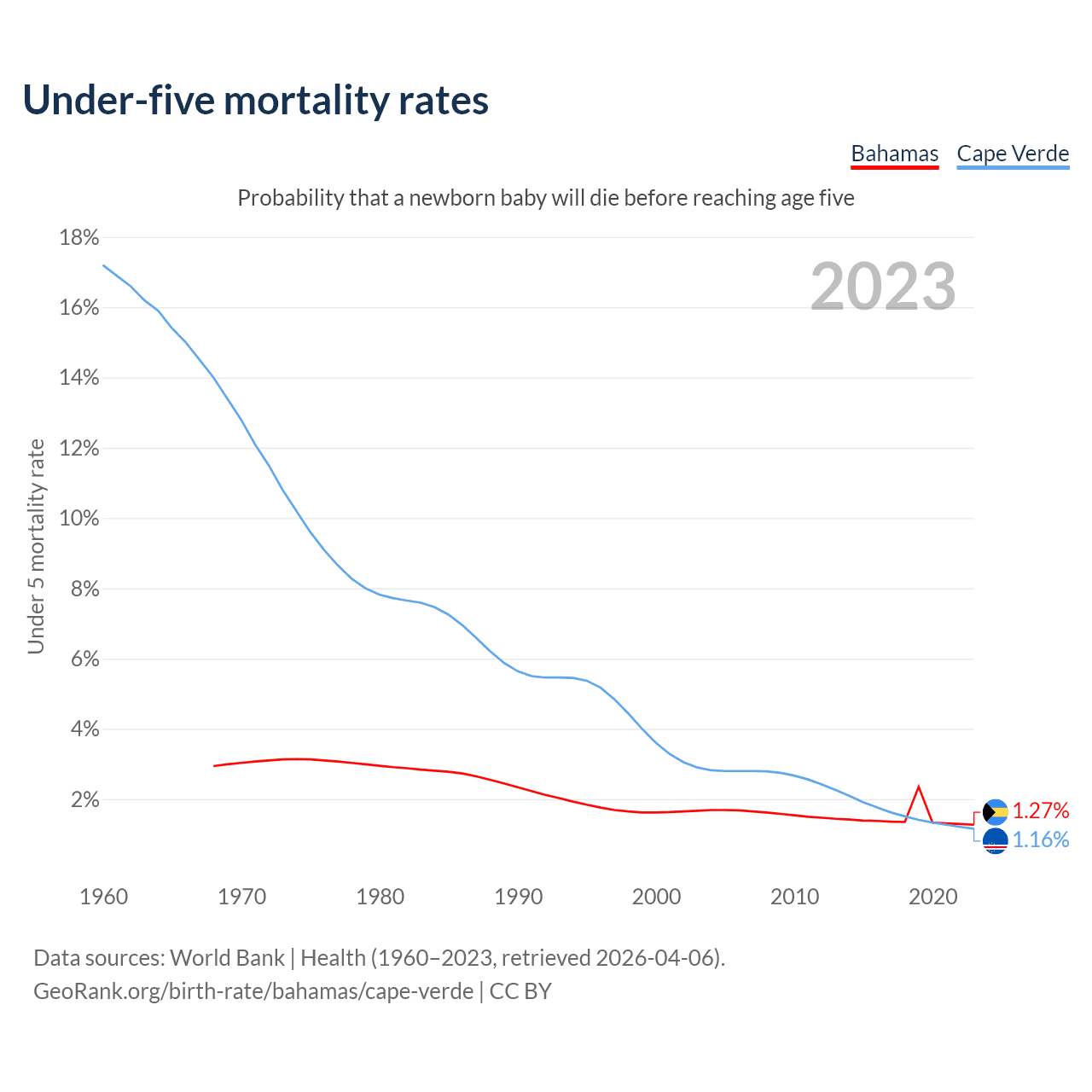 The chance that a newborn baby will die before reaching age five is 1.27% in the Bahamas and 1.16% in Cape Verde. Above is a chart with historical data on under-five mortality rates.