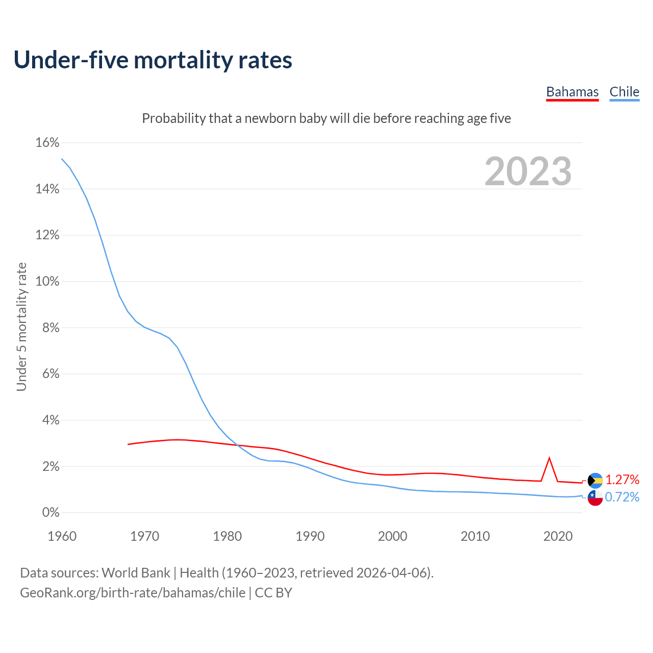 The chance that a newborn baby will die before reaching age five is 1.27% in the Bahamas and 0.72% in Chile. Above is a chart with historical data on under-five mortality rates.