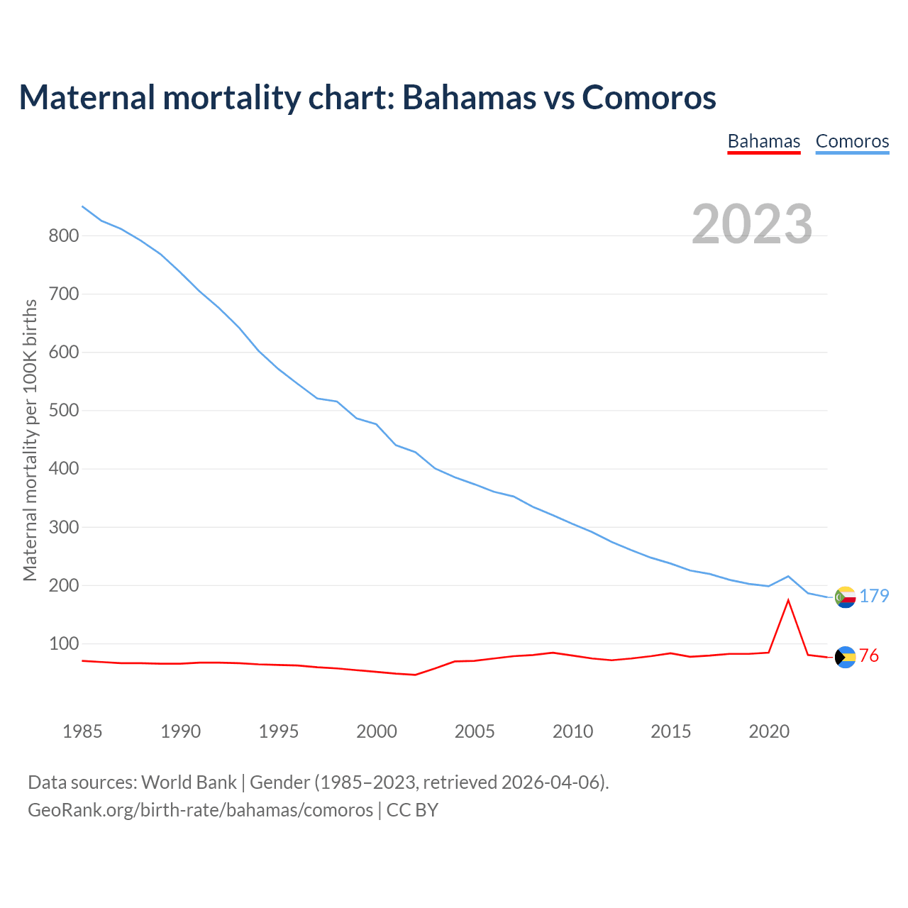 The maternal mortality rate, which is the probability of dying during childbirth or within 42 days of pregnancy termination, is 76 deaths per 100,000 live births in the Bahamas, compared to 179 deaths in Comoros.