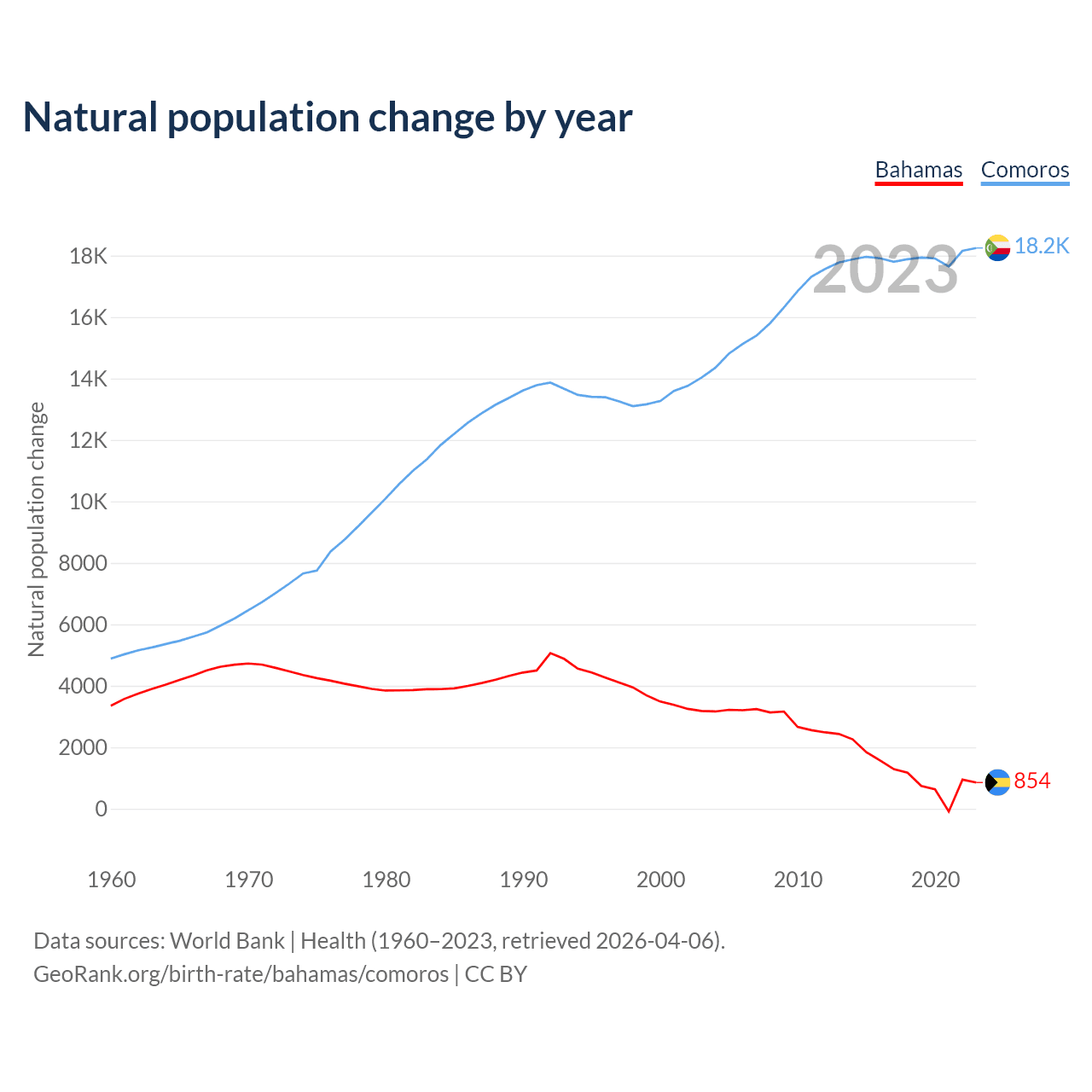 The Bahamas has an annual birth rate of 10.9 births per 1,000 people, compared to 28.7 for Comoros. The average number of children a woman is expected to have during her lifetime — the fertility rate, is 1.37 in the Bahamas and 3.88 in Comoros — 182.4% difference.