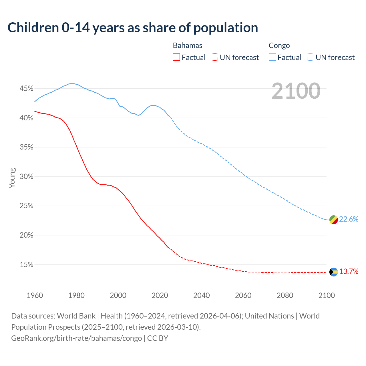 According to the latest available data on birth rates, the fertility rate in the Bahamas was 1.37 children per woman in 2023, compared to 4.16 in the Congo in 2023. The replacement level is considered to be 2.1 children per woman.
