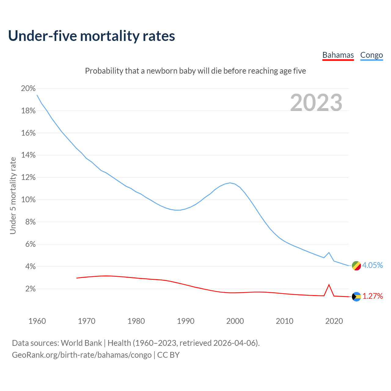 The chance that a newborn baby will die before reaching age five is 1.27% in the Bahamas and 4.05% in the Congo. Above is a chart with historical data on under-five mortality rates.
