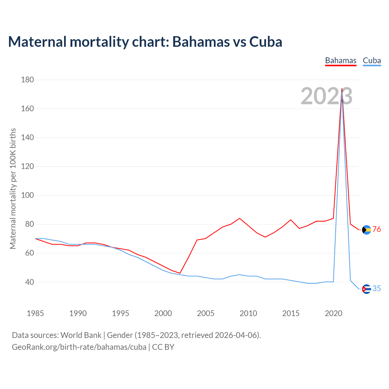 The maternal mortality rate, which is the probability of dying during childbirth or within 42 days of pregnancy termination, is 76 deaths per 100,000 live births in the Bahamas, compared to 35 deaths in Cuba.