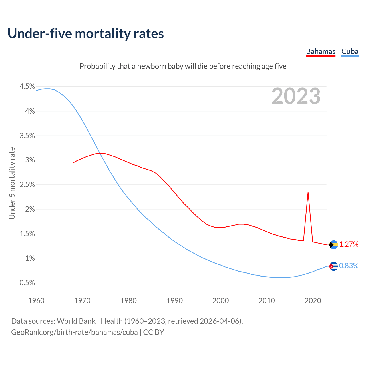 The chance that a newborn baby will die before reaching age five is 1.27% in the Bahamas and 0.83% in Cuba. Above is a chart with historical data on under-five mortality rates.