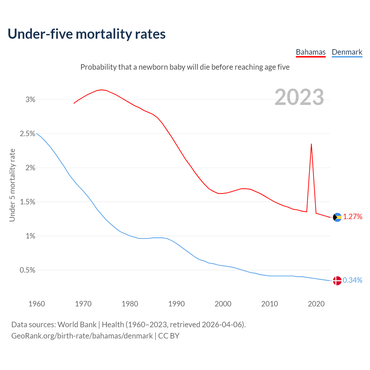 The chance that a newborn baby will die before reaching age five is 1.27% in the Bahamas and 0.34% in Denmark. Above is a chart with historical data on under-five mortality rates.