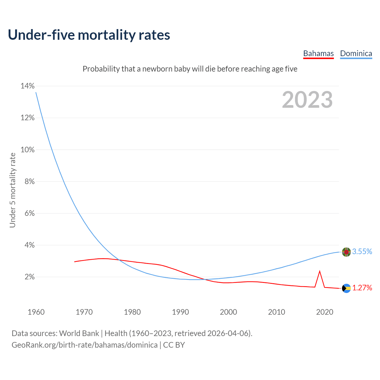 The chance that a newborn baby will die before reaching age five is 1.27% in the Bahamas and 3.55% in Dominica. Above is a chart with historical data on under-five mortality rates.