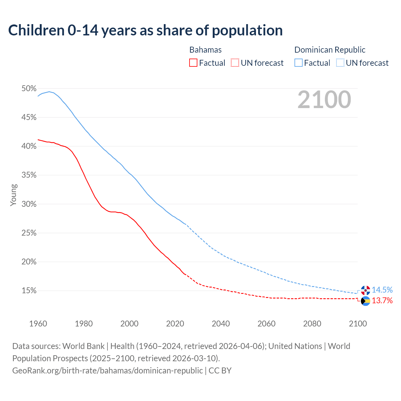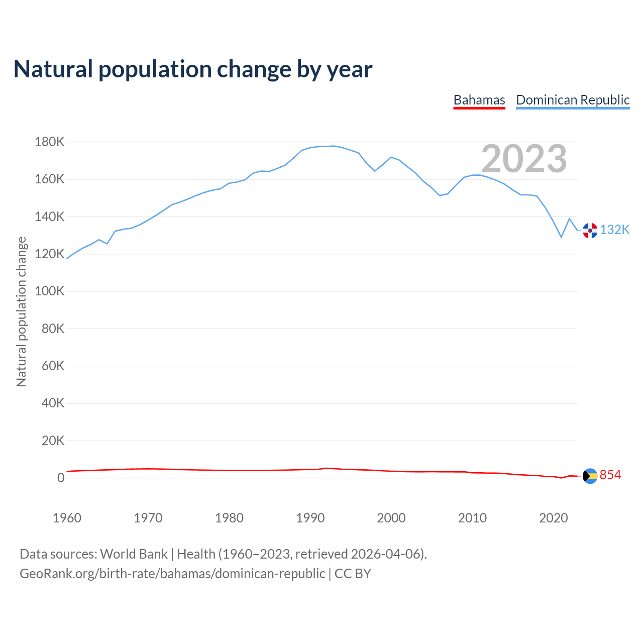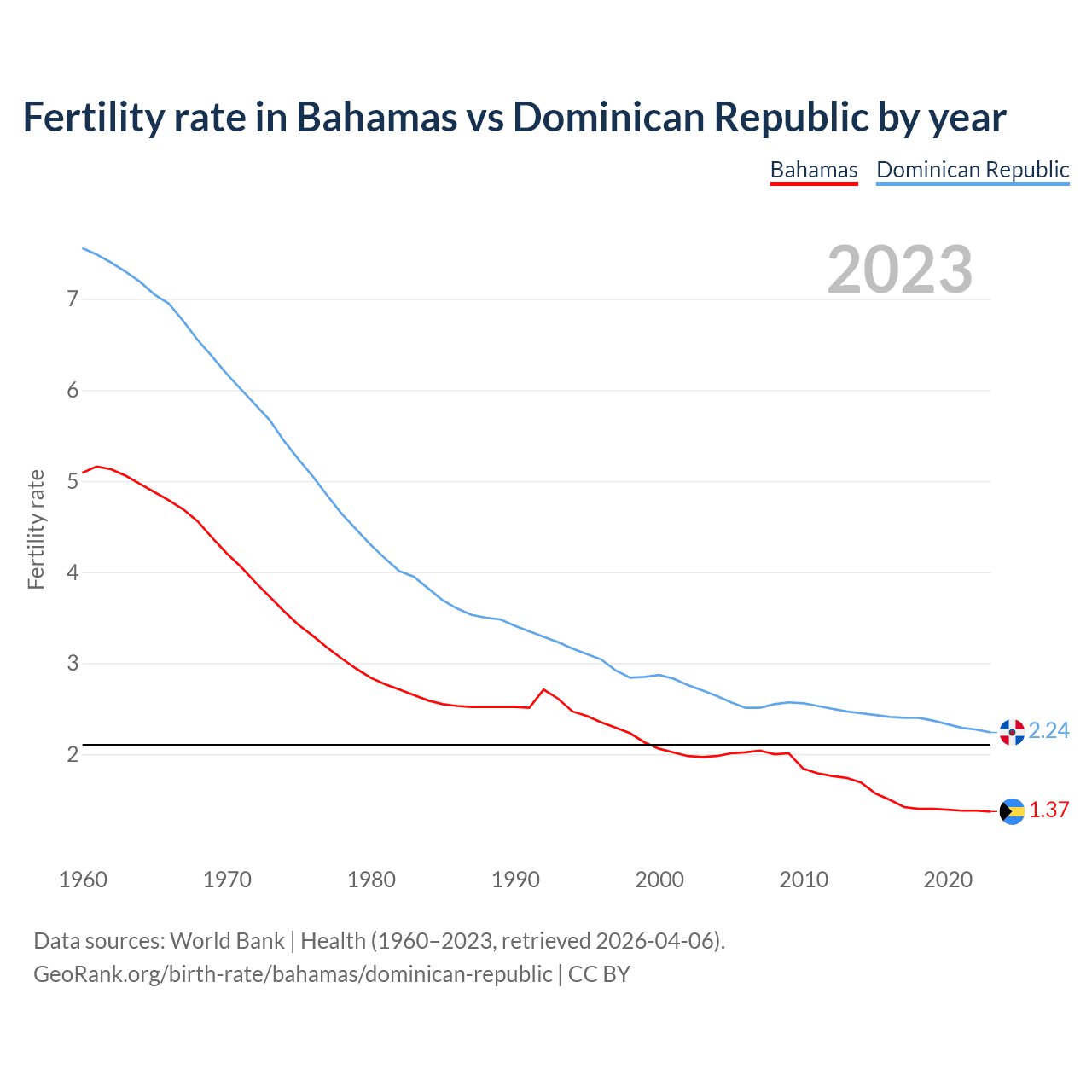 According to the latest available data on birth rates, the fertility rate in the Bahamas was 1.37 children per woman in 2023, compared to 2.24 in the Dominican Republic in 2023. The replacement level is considered to be 2.1 children per woman.