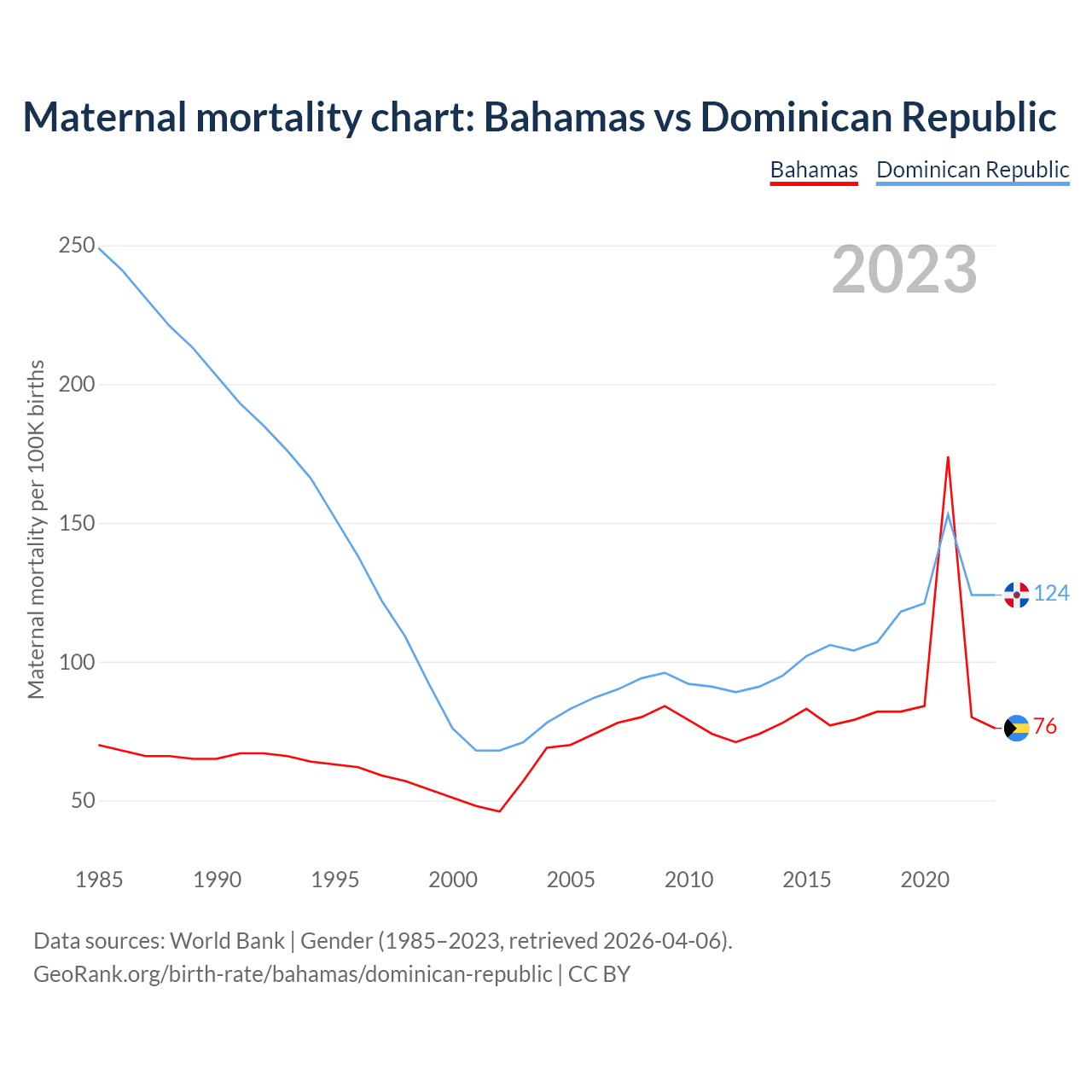 The maternal mortality rate, which is the probability of dying during childbirth or within 42 days of pregnancy termination, is 76 deaths per 100,000 live births in the Bahamas, compared to 124 deaths in the Dominican Republic.