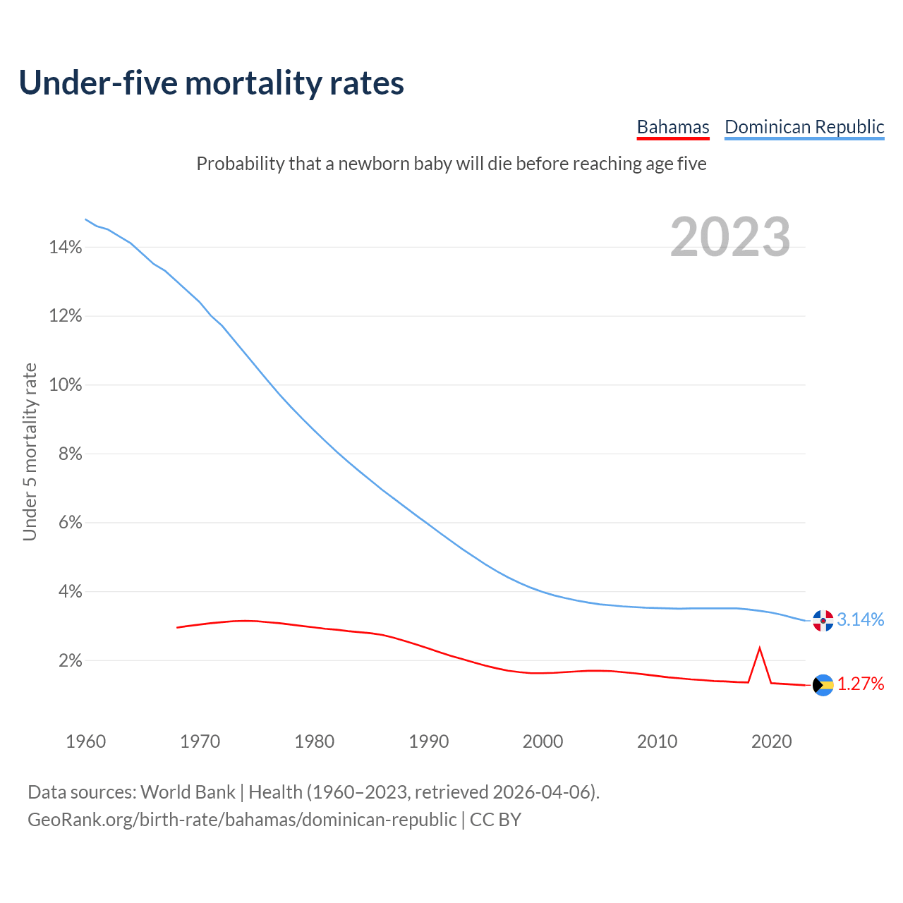 The chance that a newborn baby will die before reaching age five is 1.27% in the Bahamas and 3.14% in the Dominican Republic. Above is a chart with historical data on under-five mortality rates.