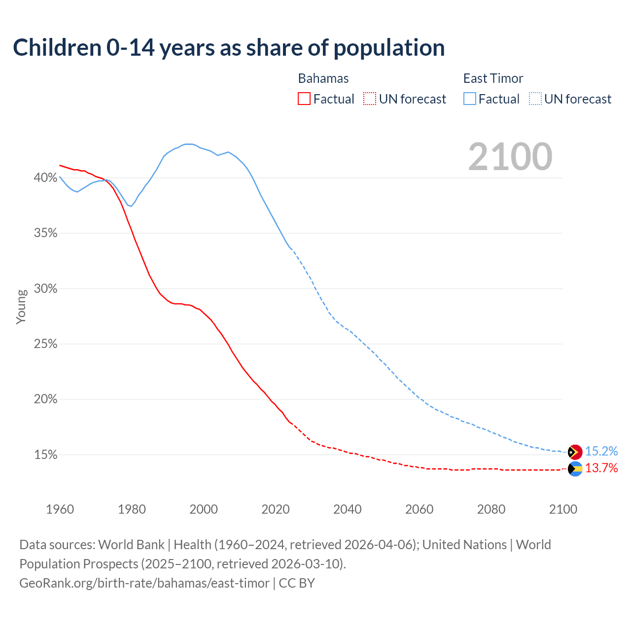 According to the latest available data on birth rates, the fertility rate in the Bahamas was 1.37 children per woman in 2023, compared to 2.71 in East Timor in 2023. The replacement level is considered to be 2.1 children per woman.