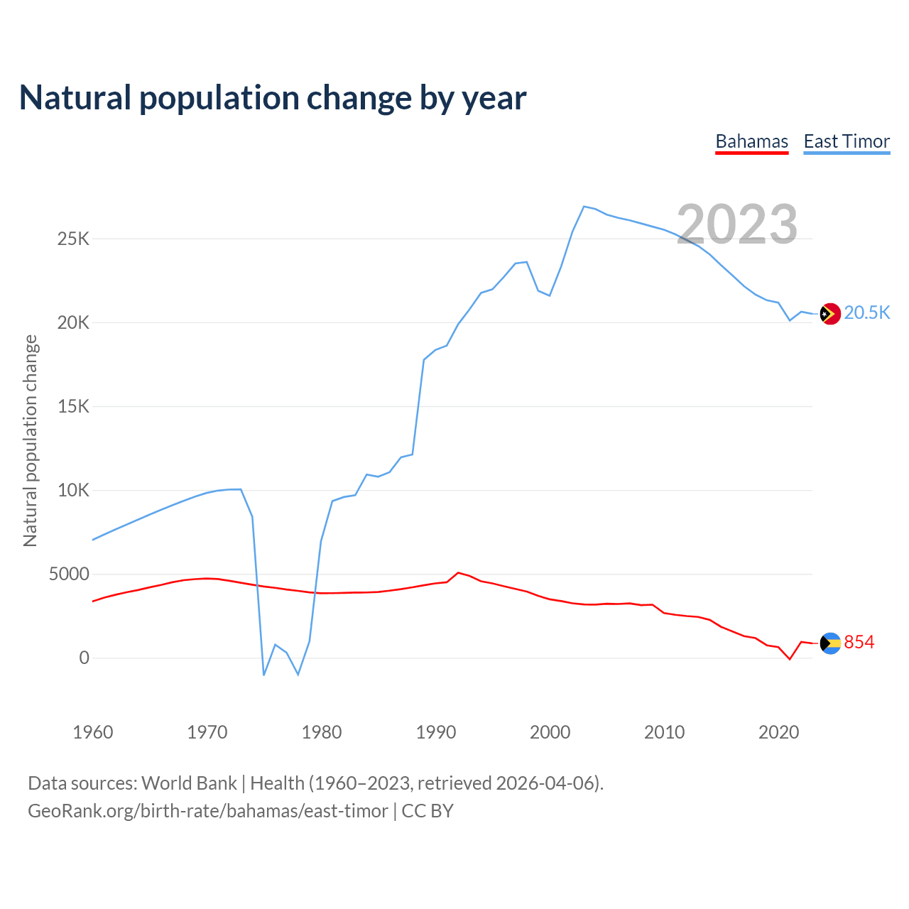 The Bahamas has an annual birth rate of 10.9 births per 1,000 people, compared to 22.1 for East Timor. The average number of children a woman is expected to have during her lifetime — the fertility rate, is 1.37 in the Bahamas and 2.71 in East Timor — 97.2% difference.