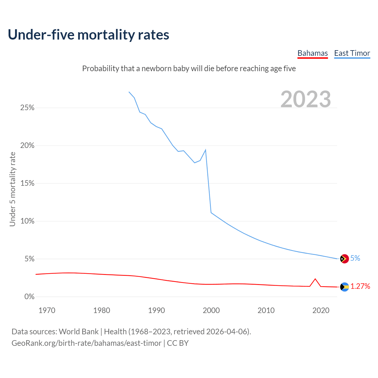 The chance that a newborn baby will die before reaching age five is 1.27% in the Bahamas and 5% in East Timor. Above is a chart with historical data on under-five mortality rates.