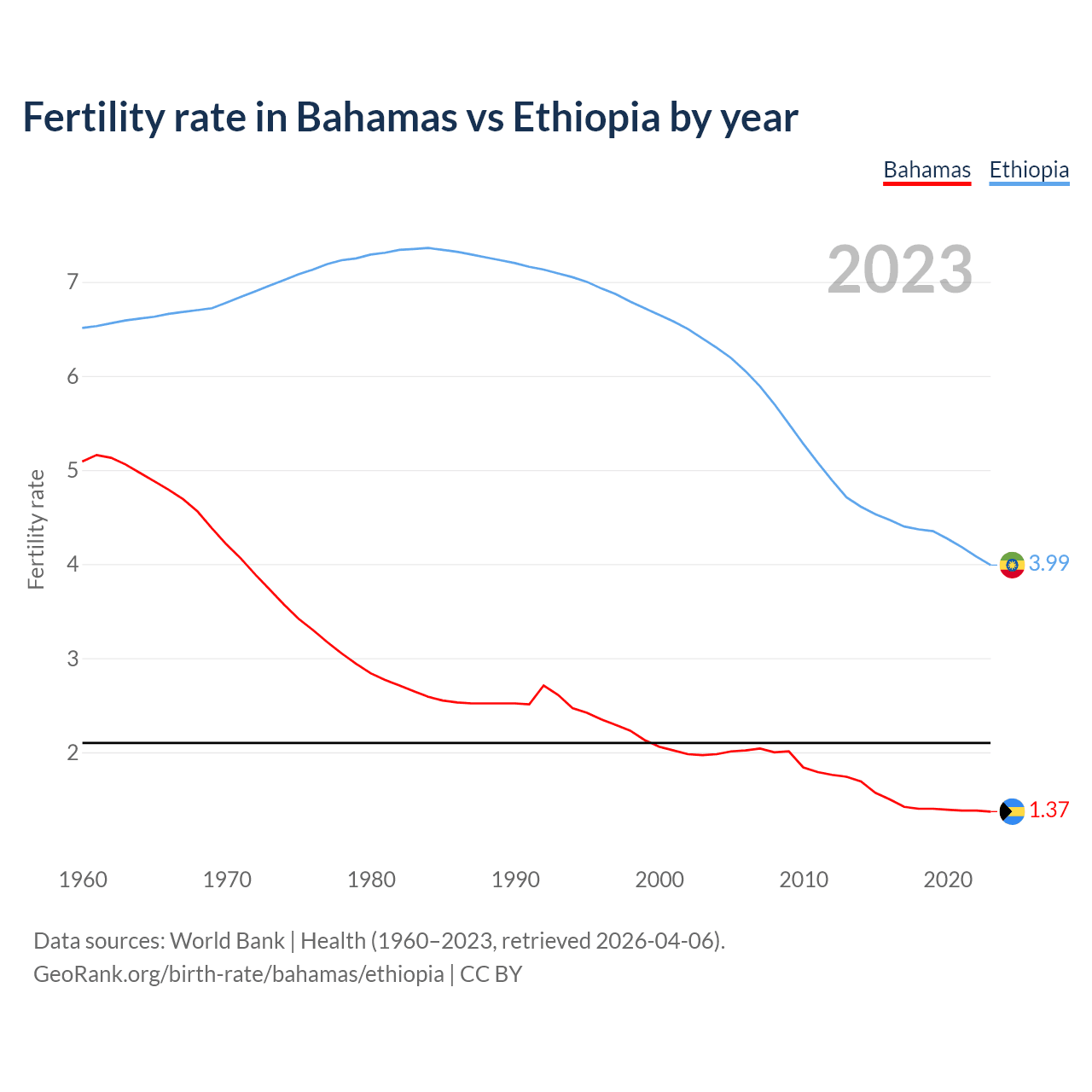 1960 vs 2023, the fertility rate has decreased by 73% in the Bahamas and by 38.8% in Ethiopia — in 1960, it was 5.09 and 6.51, respectively.
