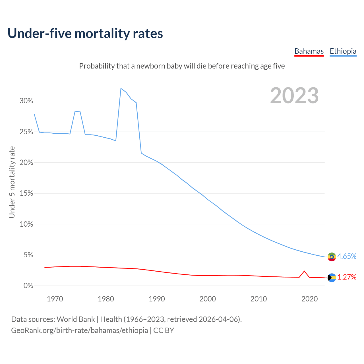 The chance that a newborn baby will die before reaching age five is 1.27% in the Bahamas and 4.65% in Ethiopia. Above is a chart with historical data on under-five mortality rates.