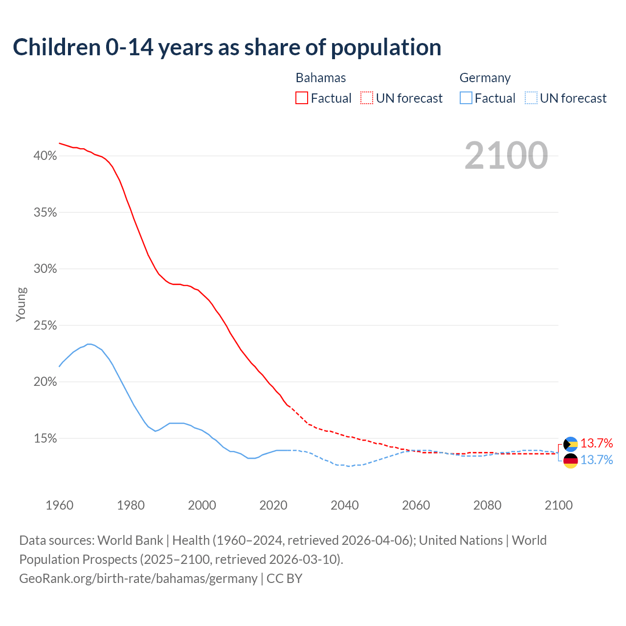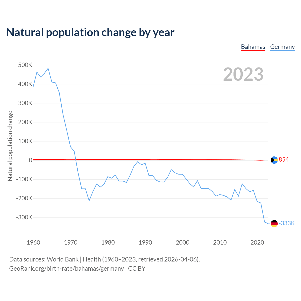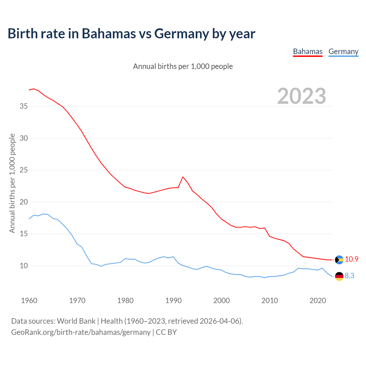 The Bahamas has an annual birth rate of 10.9 births per 1,000 people, compared to 8.3 for Germany. The average number of children a woman is expected to have during her lifetime — the fertility rate, is 1.37 in the Bahamas and 1.39 in Germany — 1.24% difference.