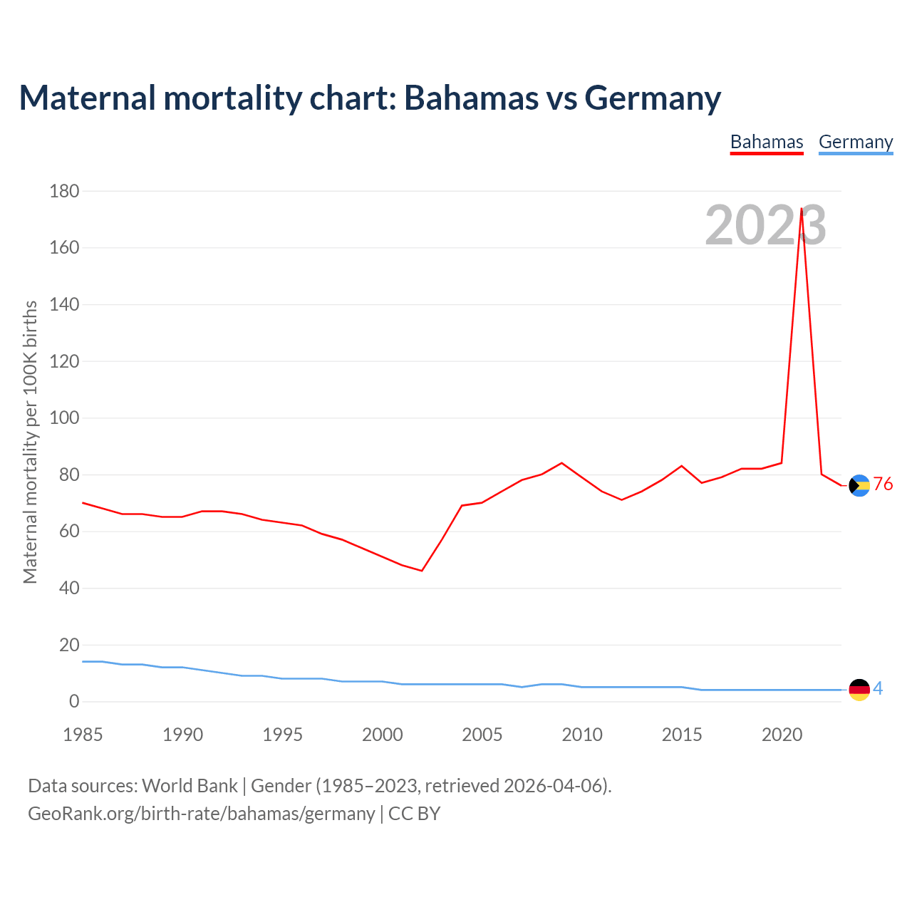 The maternal mortality rate, which is the probability of dying during childbirth or within 42 days of pregnancy termination, is 76 deaths per 100,000 live births in the Bahamas, compared to 4 deaths in Germany.