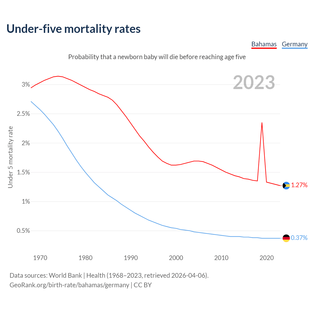 The chance that a newborn baby will die before reaching age five is 1.27% in the Bahamas and 0.37% in Germany. Above is a chart with historical data on under-five mortality rates.