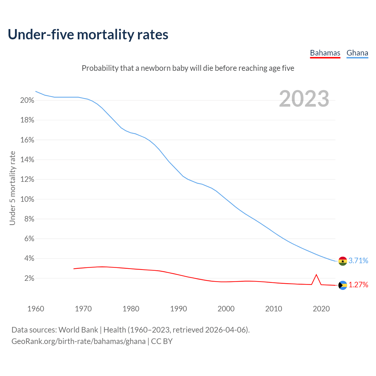 The chance that a newborn baby will die before reaching age five is 1.27% in the Bahamas and 3.71% in Ghana. Above is a chart with historical data on under-five mortality rates.