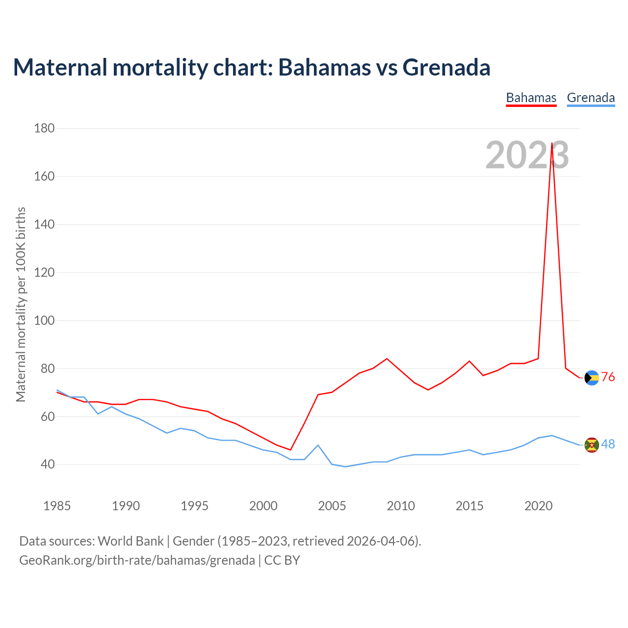 The maternal mortality rate, which is the probability of dying during childbirth or within 42 days of pregnancy termination, is 76 deaths per 100,000 live births in the Bahamas, compared to 48 deaths in Grenada.