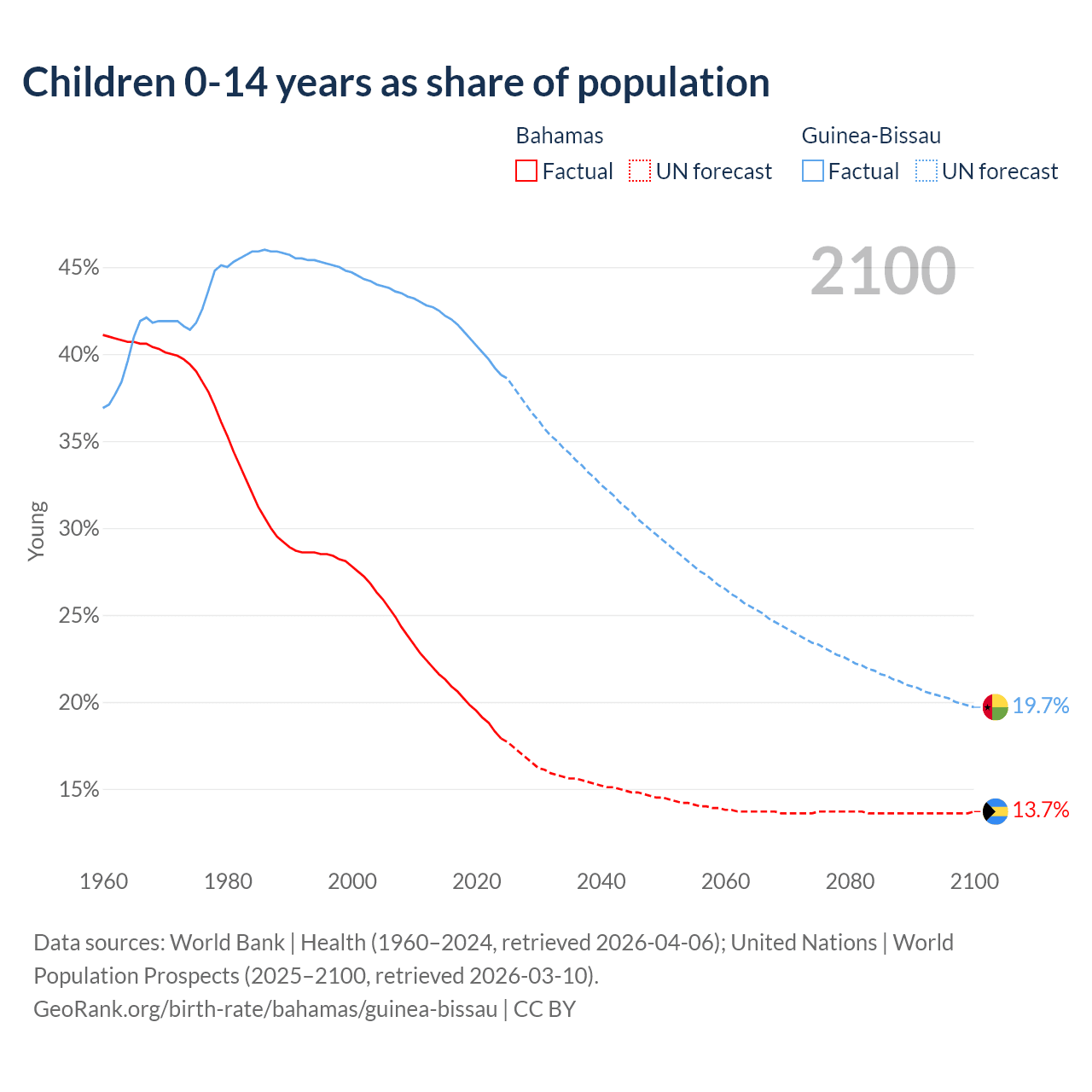 According to the latest available data on birth rates, the fertility rate in the Bahamas was 1.37 children per woman in 2023, compared to 3.84 in Guinea-Bissau in 2023. The replacement level is considered to be 2.1 children per woman.