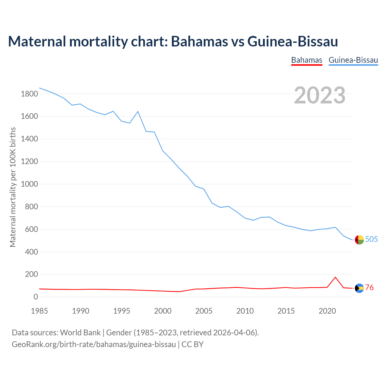 The maternal mortality rate, which is the probability of dying during childbirth or within 42 days of pregnancy termination, is 76 deaths per 100,000 live births in the Bahamas, compared to 505 deaths in Guinea-Bissau.