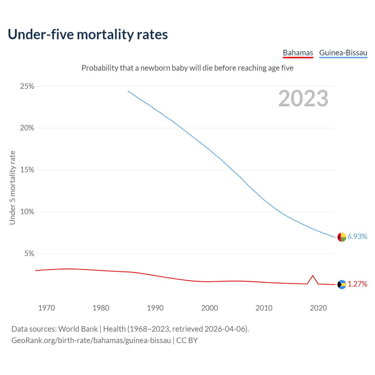 The chance that a newborn baby will die before reaching age five is 1.27% in the Bahamas and 6.93% in Guinea-Bissau. Above is a chart with historical data on under-five mortality rates.