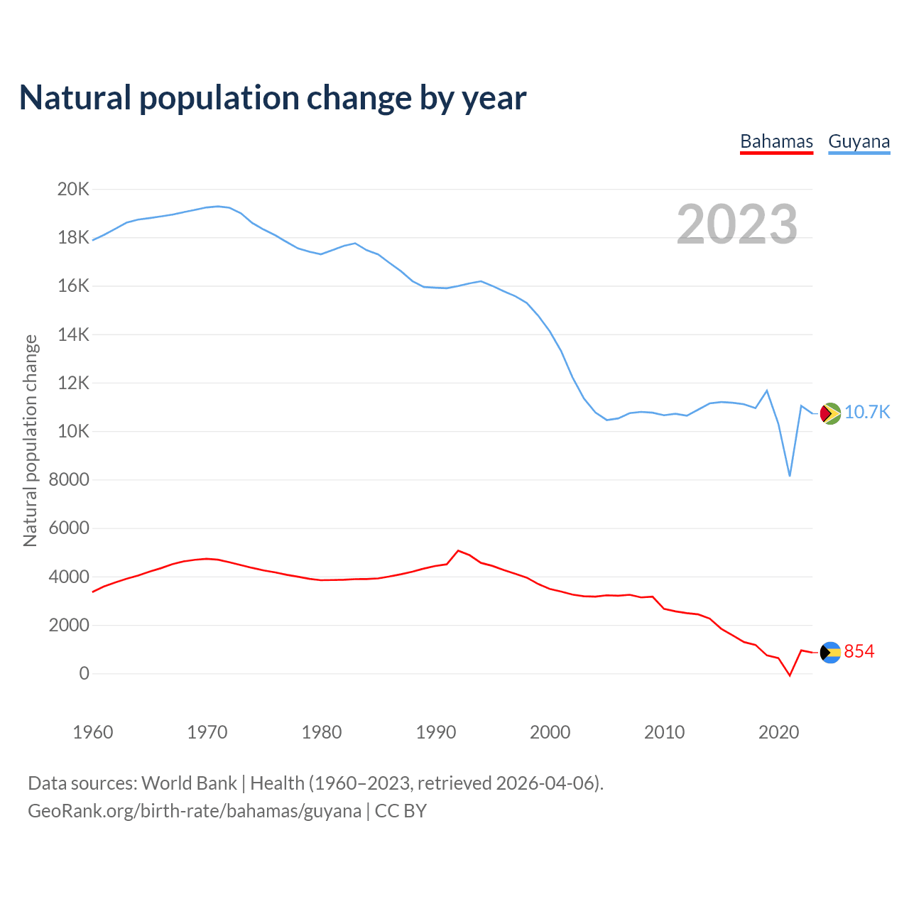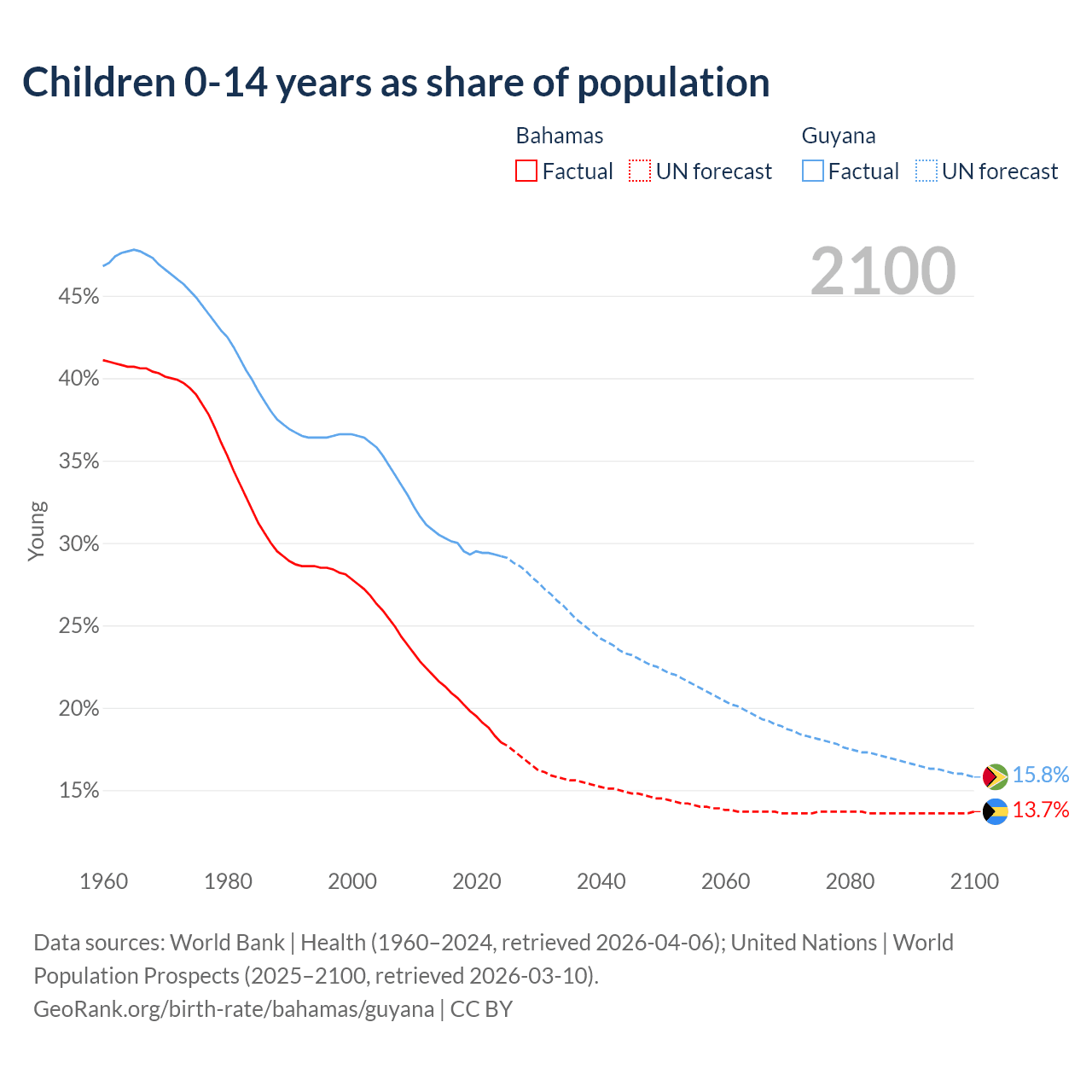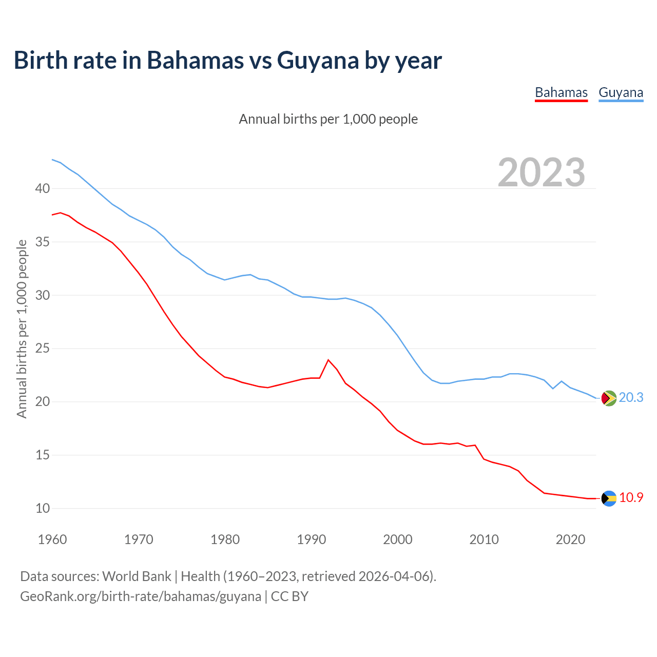According to the latest available data on birth rates, the fertility rate in the Bahamas was 1.37 children per woman in 2023, compared to 2.41 in Guyana in 2023. The replacement level is considered to be 2.1 children per woman.