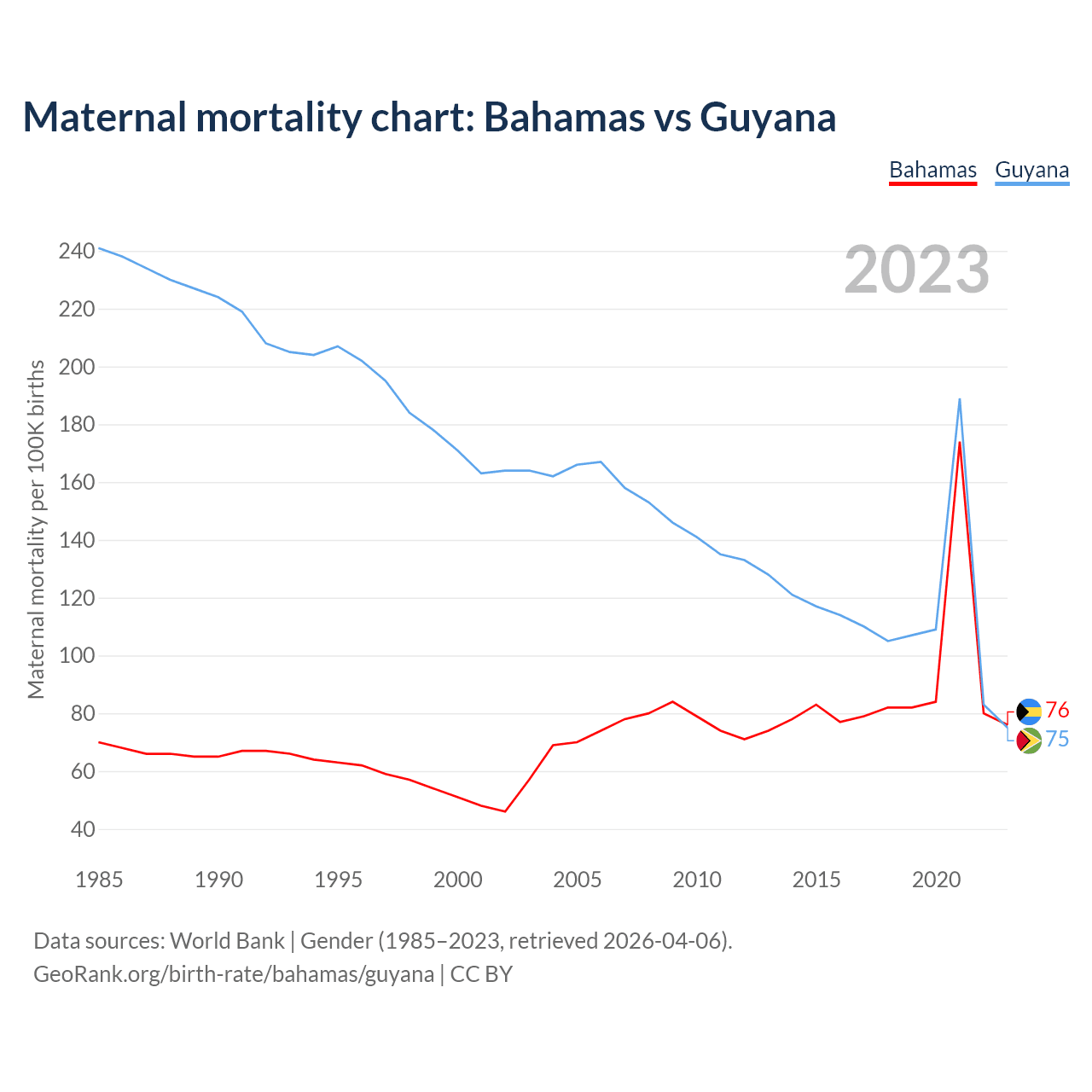 The maternal mortality rate, which is the probability of dying during childbirth or within 42 days of pregnancy termination, is 76 deaths per 100,000 live births in the Bahamas, compared to 75 deaths in Guyana.