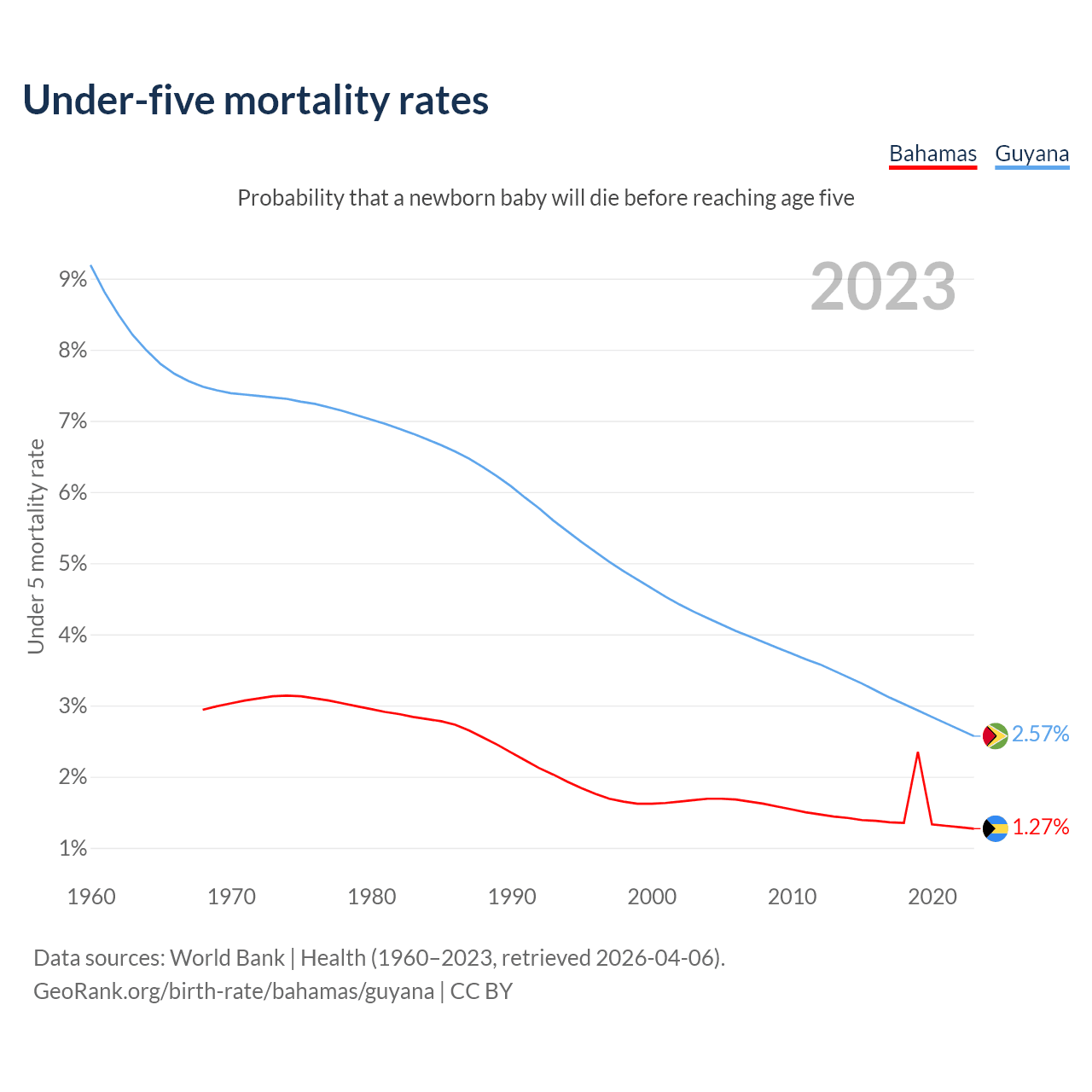 The chance that a newborn baby will die before reaching age five is 1.27% in the Bahamas and 2.57% in Guyana. Above is a chart with historical data on under-five mortality rates.
