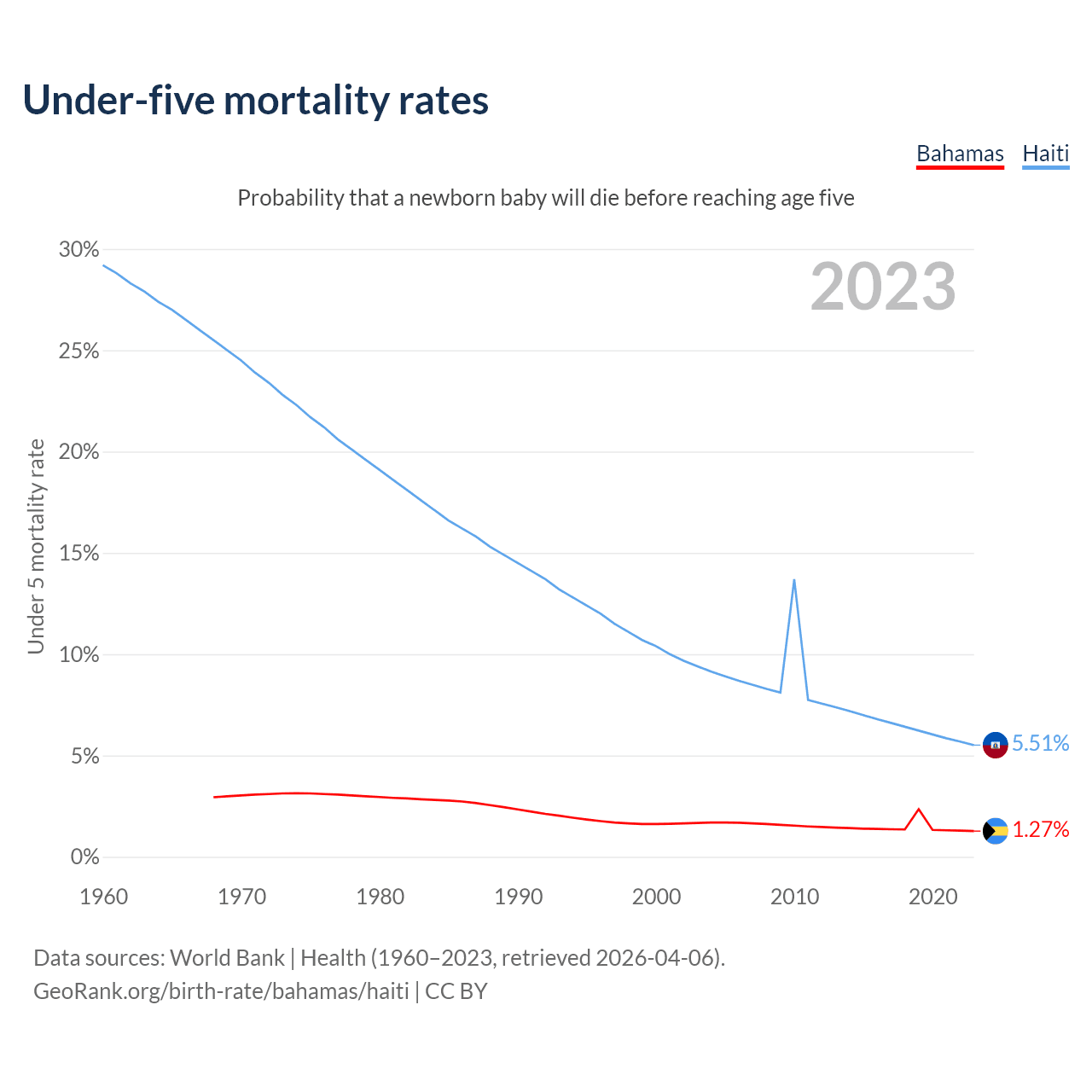 The chance that a newborn baby will die before reaching age five is 1.27% in the Bahamas and 5.51% in Haiti. Above is a chart with historical data on under-five mortality rates.
