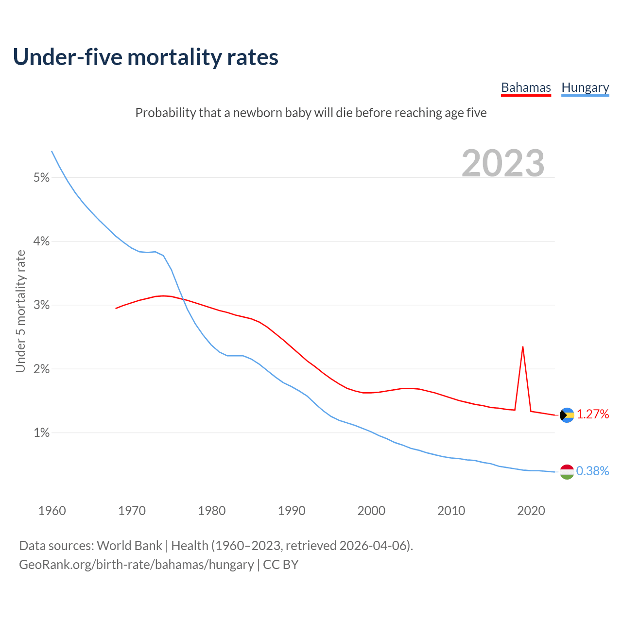 The chance that a newborn baby will die before reaching age five is 1.27% in the Bahamas and 0.38% in Hungary. Above is a chart with historical data on under-five mortality rates.